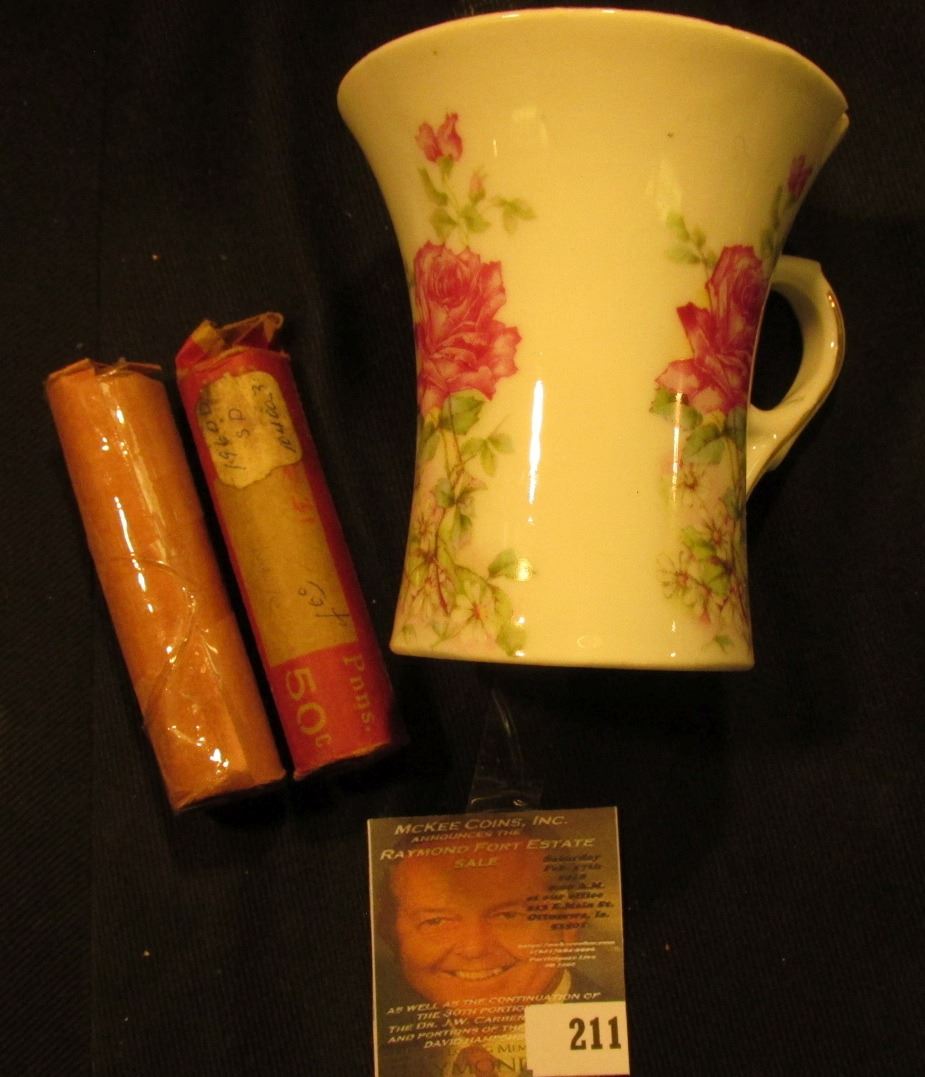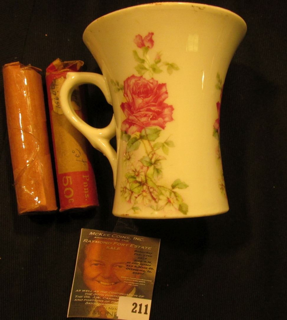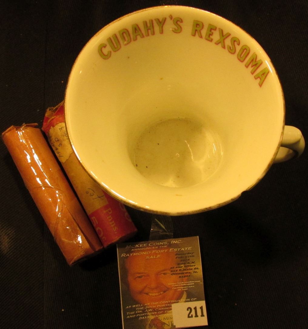 Porcelain Advertising Cup "Cudahy's Rexoma". Depicts Pink Roses. Single small chip in the lip. Includes a circulated roll of 1948 S solid-date Roll of Wheat Cents & 1960 D Small Date Cents.