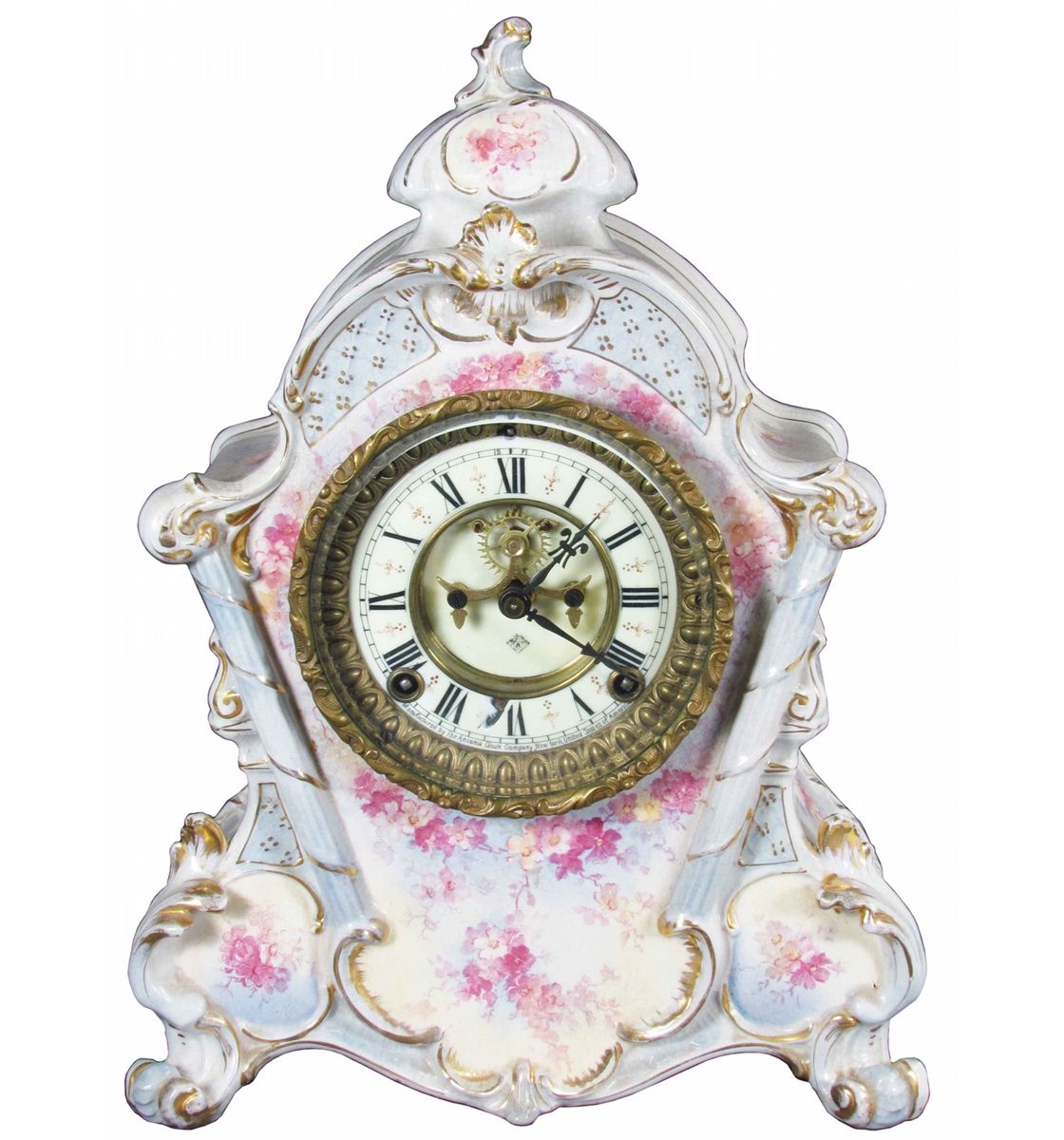 Porcelain Ansonia Mantle Clock. Ansonia Clock Co. Patent June 18, 1881. Porcelain clock dial has chip at 6:00 and normal crazing otherwise good working condition, comes with key. 10 1/4 X 14 X 4 1/2 inches.
