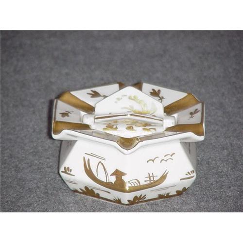 Porcelain Ashtray hand painted made in France, 4 1/4" diameter x 2 1/2" tall. White porcelain with gilt decoration, removable insert rotates to allow ashes to fall into bowl.