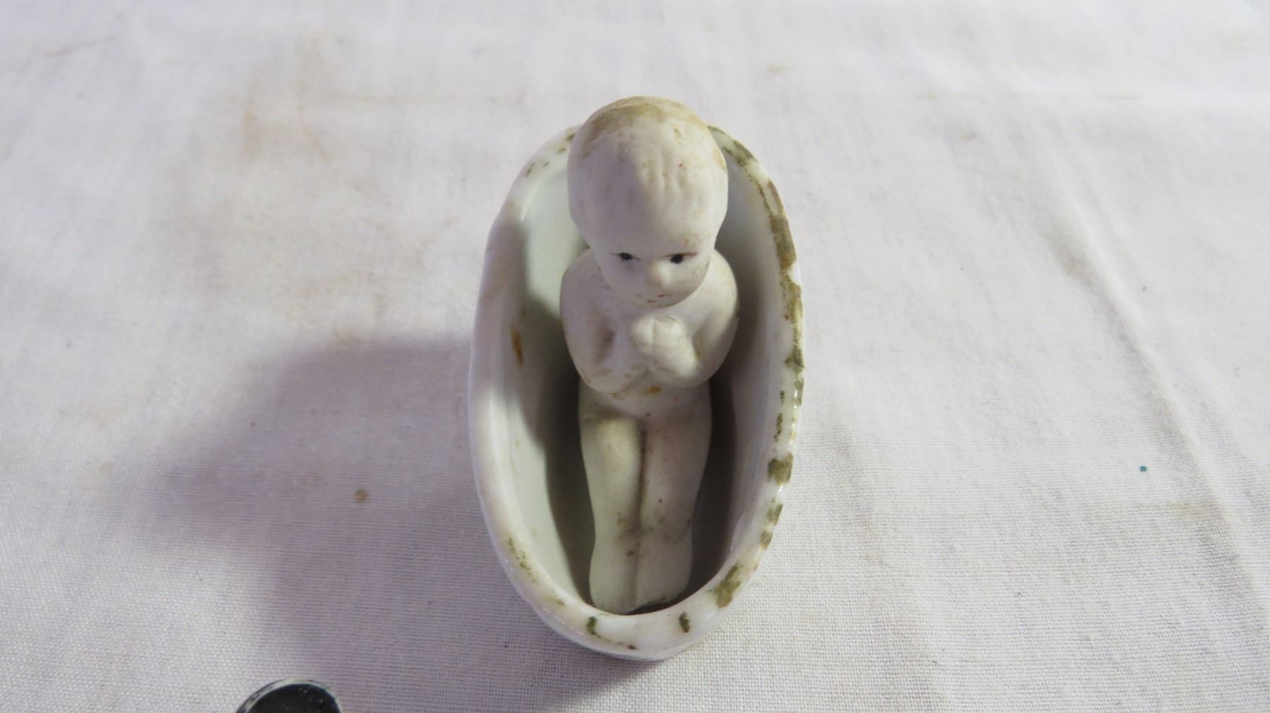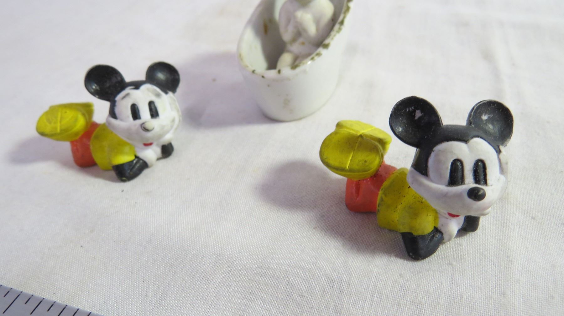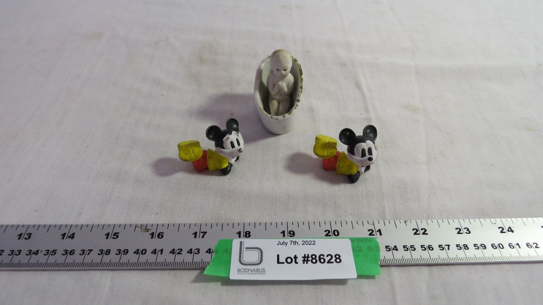 Porcelain Baby in a bathtub and (2) Mickey Rubber Figures