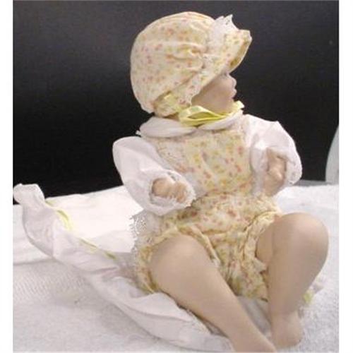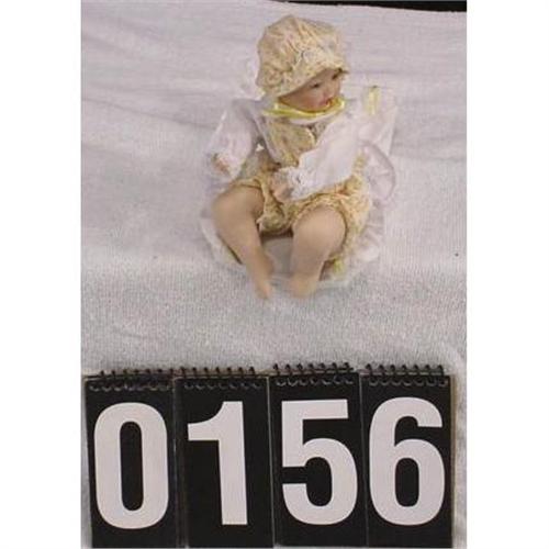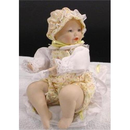 A small porcelain doll of baby in yellow clothing and cap with a white pillow. In great condition. Measures 5.5 inches long and weighs 4 ounces. [81]