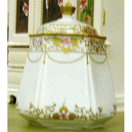 Lovely gold trimmed biscuit jar made in Japan. It has pink flowers and their is minor paint loss.