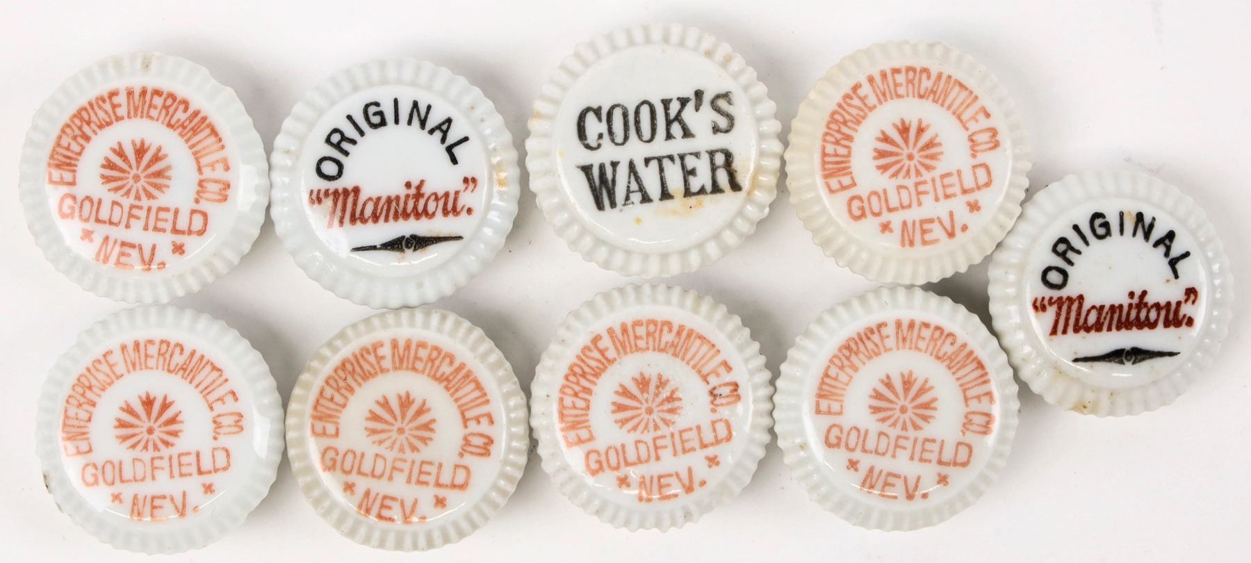 lot of 10. Goldfield Mercantile Co. Goldfield, NV. 1905. Original Manitou Bottle Cap c1900 (Colorado) and Cook's Water cap c1900 (Cook's Springs Calif.). All in excellent cond.