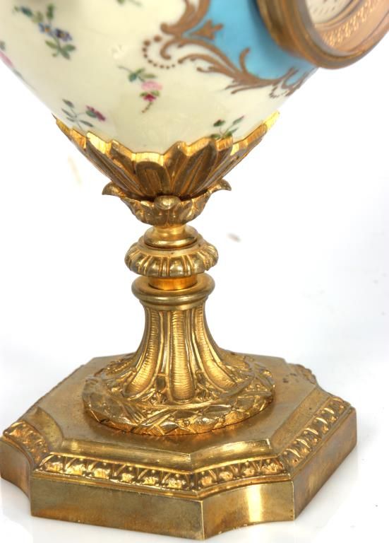 Urn Porcelain & Bronze Mantle Clock. Has an urn form with bulbous body and domical lid; gilt bronze pineapple finial and collar, figural Bacchus head handles on the sides and a filigree decorated stem and base. 3.75 in. domical porcelain dial with black Arabic hour numbers with colorful painted floral garland strand decoration, brass bezel with convex door glass; brass spring driven movement has a silvered lever platform escapement with rack & snail coiled gong half hour strike. In good running condition, balance swings freely, no cracks in the porcelain, the dial has small chips around the arbor holes. 5 in. high.