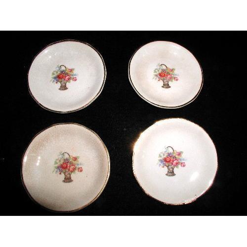 Set of 4 English porcelain butter pats with hand painted floral design and gilt edges. Slight checking to one,the others in excellent condition. No nicks,chips or cracks on any of the 4. Eggshell background. Measure 3.25W X 3.25L.