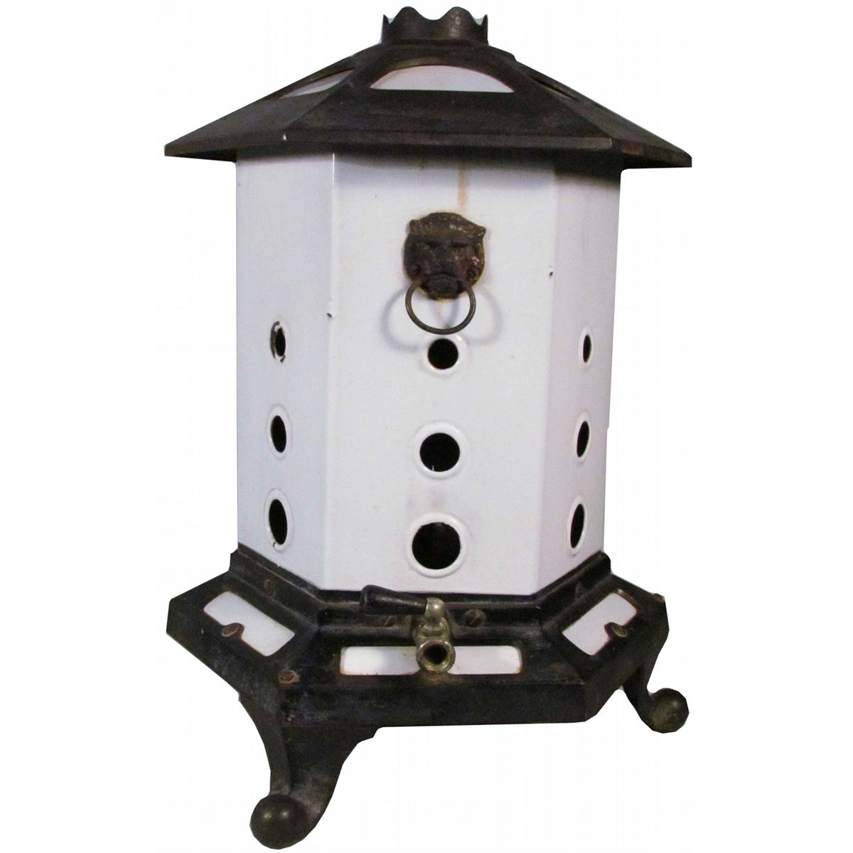 Reliable Brand Gas Heater. Porcelain & Cast iron. Lion heads with rings. Crack in cast iron top and some wear around holes otherwise good condition. 13 inch diameter X 22 inches tall.