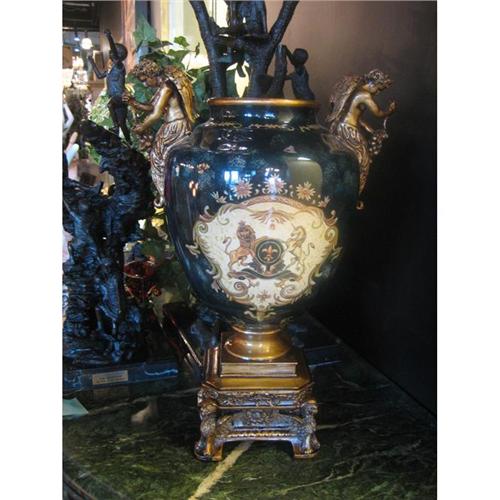 This beautiful handpainted porcelain vase has a gold cherub on either side of the top lip. The unique color us see is a mixture of a black and blue swirled together. This vase would look beautiful in any room you chose.