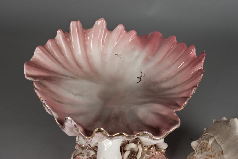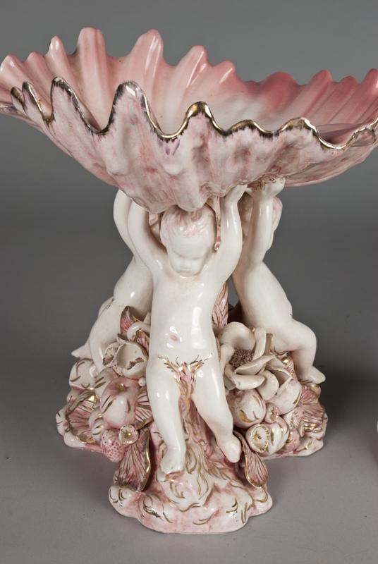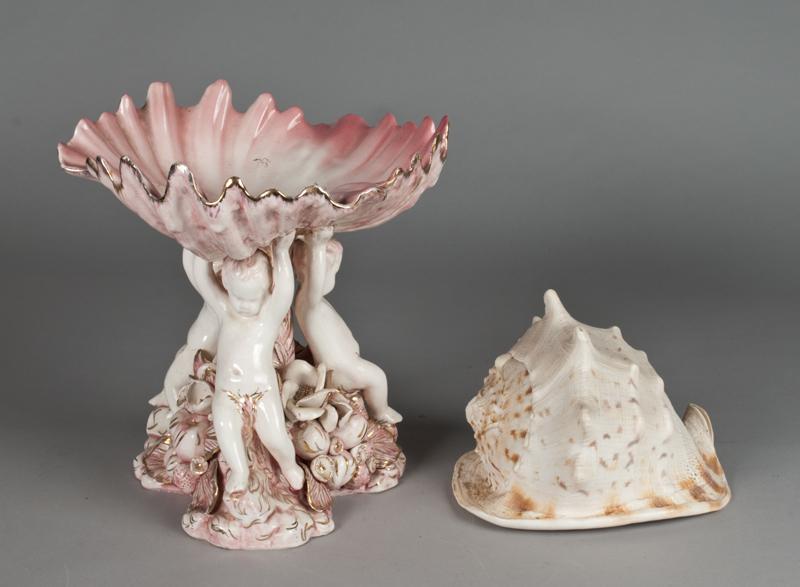 Includes a large centerpiece with three small children leanig against a tree and holding up a floral form bowl with various fruits and leaves near their feet, with heay gilt hightlights throughout. 13" H x 13" W, some small fleck chips around bowl, crazing throughout. Together with a large seashell, 9.5" L.