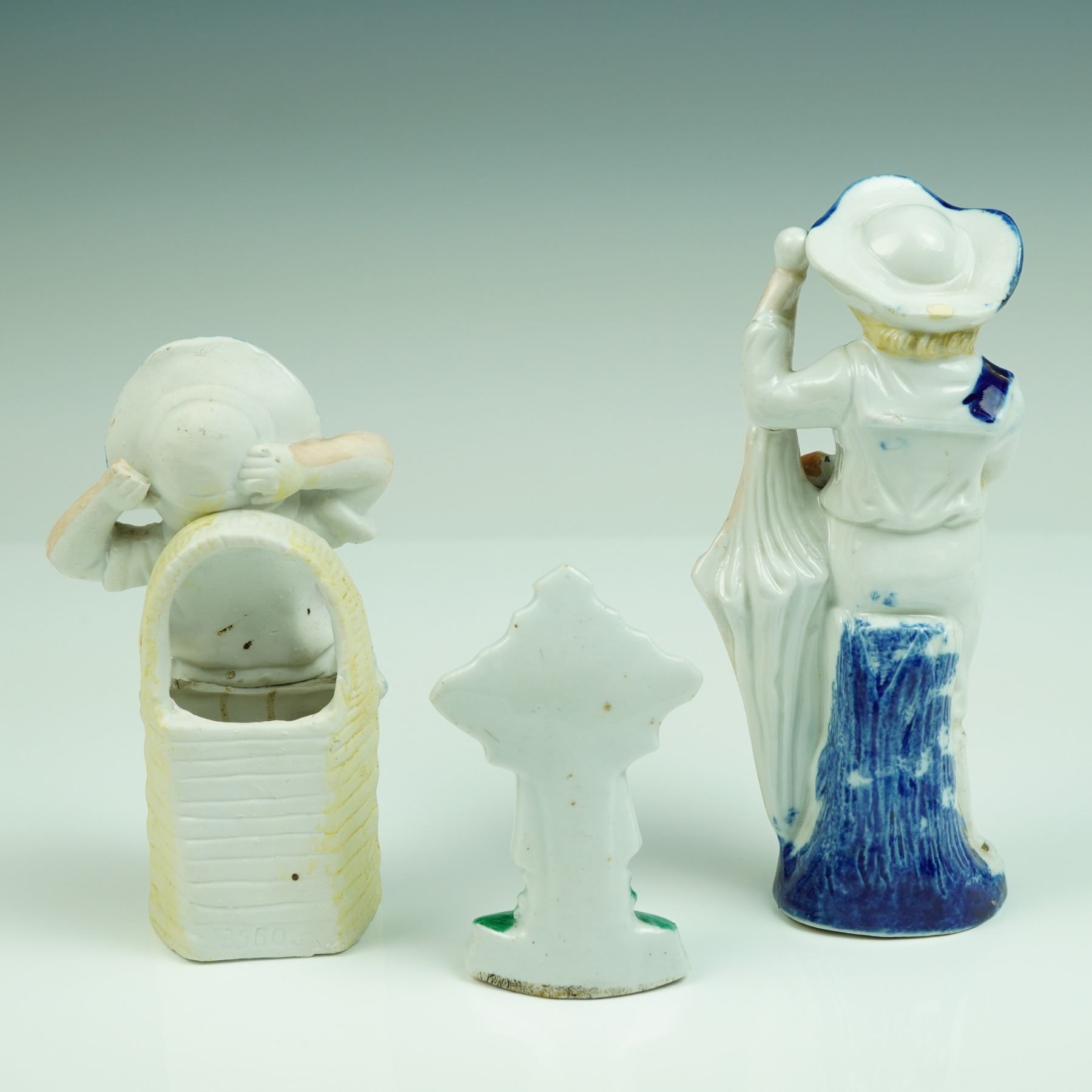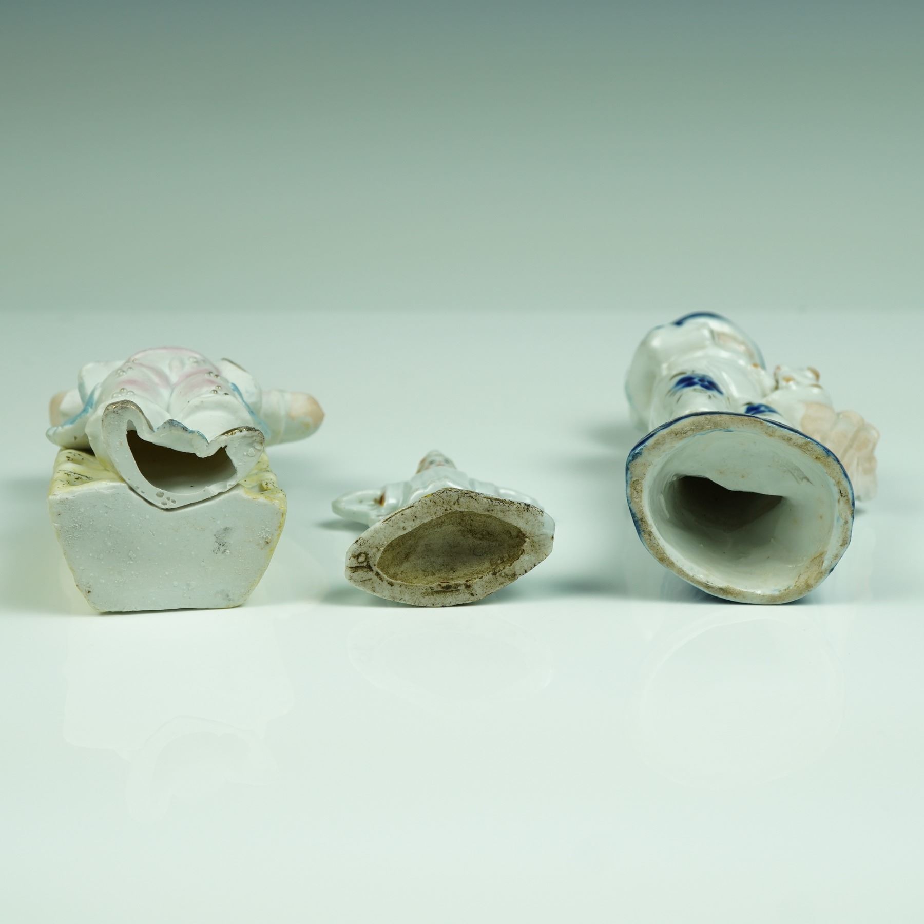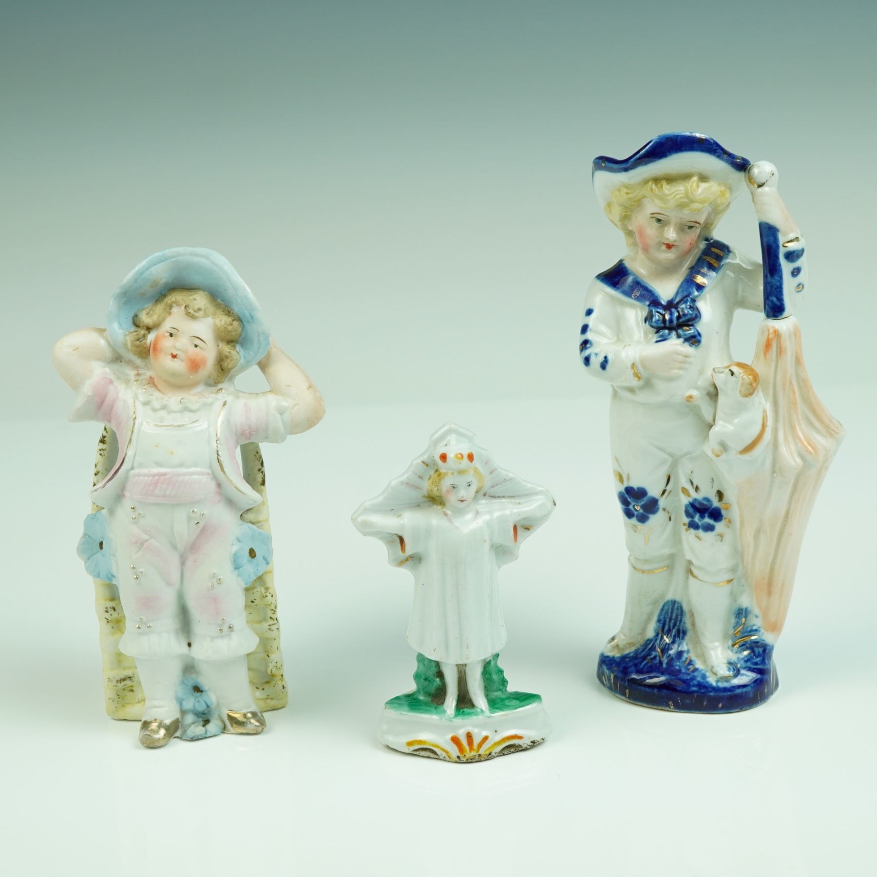 An utterly charming trio of figural fairings depicting children in whimsical poses, each crafted with delightful detail and hand-painted charm. The group includes a young boy in a pastel pink suit with a broad-brimmed hat lounging with arms behind his head, a smaller figure of a child in white with orange accents in a crown-like bonnet, and a larger sailor boy in blue and white attire holding an umbrella with his faithful dog peeking out. These hollow figures showcase vibrant underglaze colors, naive expressions, and mold seams visible on the undersides, all in excellent display-ready condition with expected age wear. Perfect for collectors of childhood motifs.