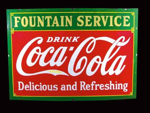 Two sided porcelain Coca Cola Fountain Service sign, 4 color, 60 inches x 42 inches wide, both sides excellent condition, small chips at grommets, dated 1933.