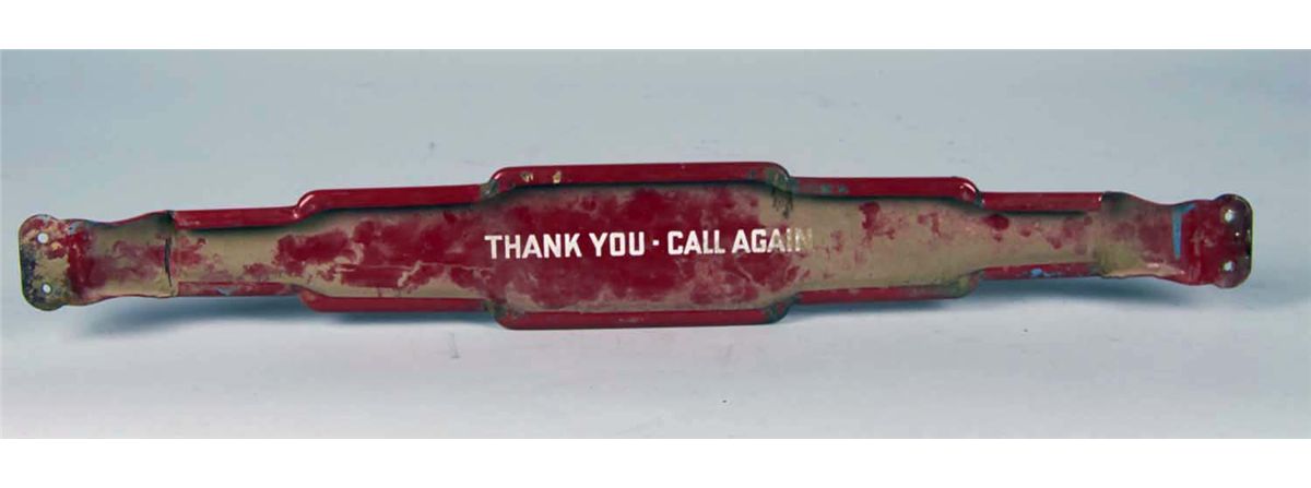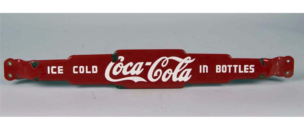 "Ice Cold Coca Cola in Bottles" door push bar, Trade Mark in tail, circa 1940s. Condition (Good). Size 4 1/4" x 30"