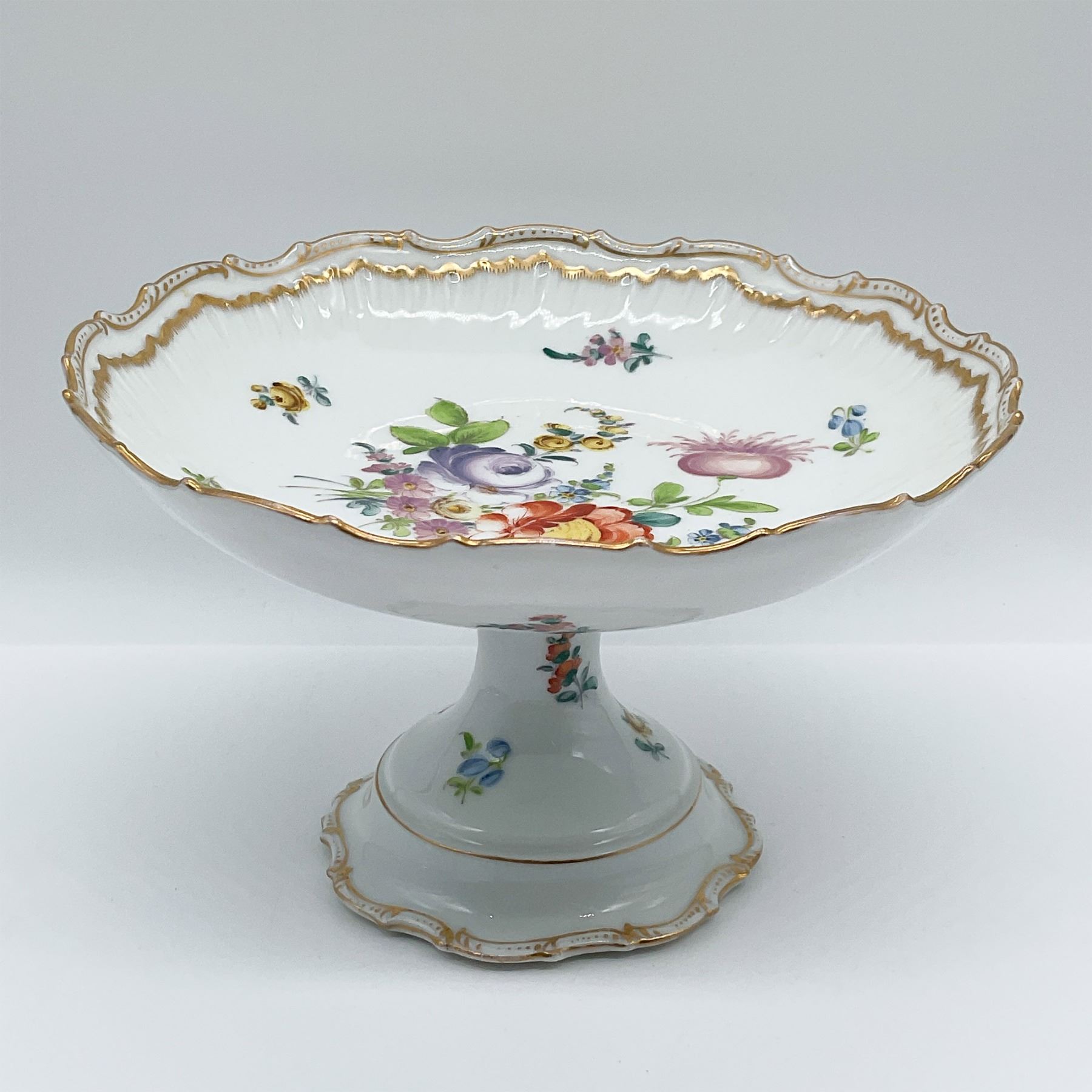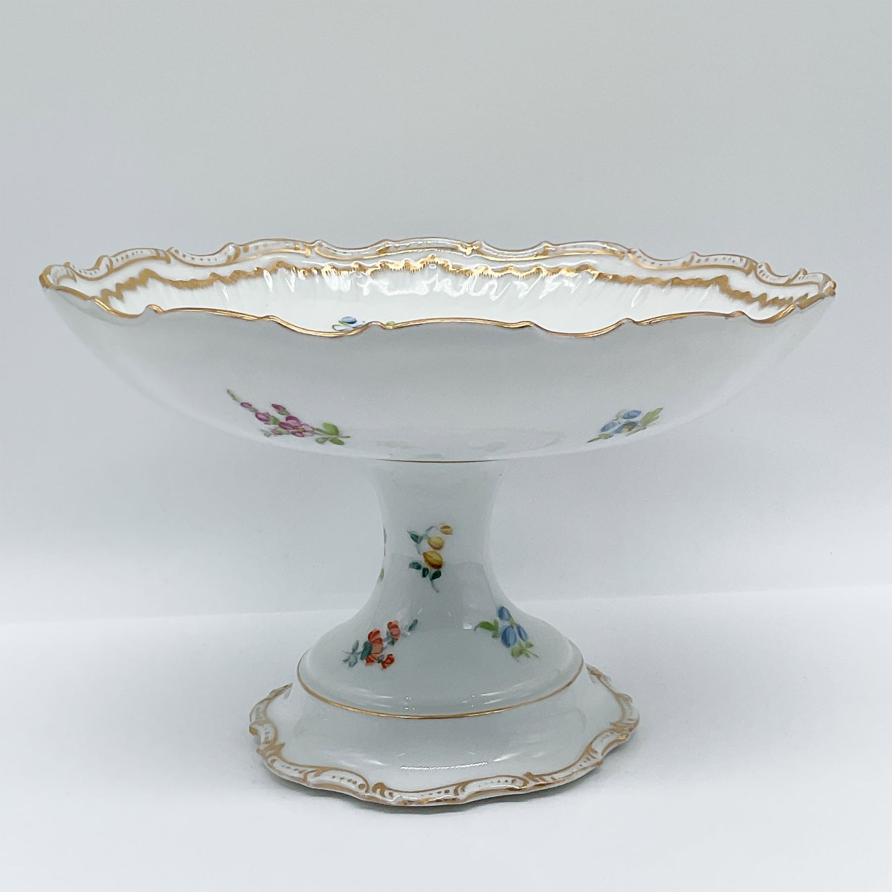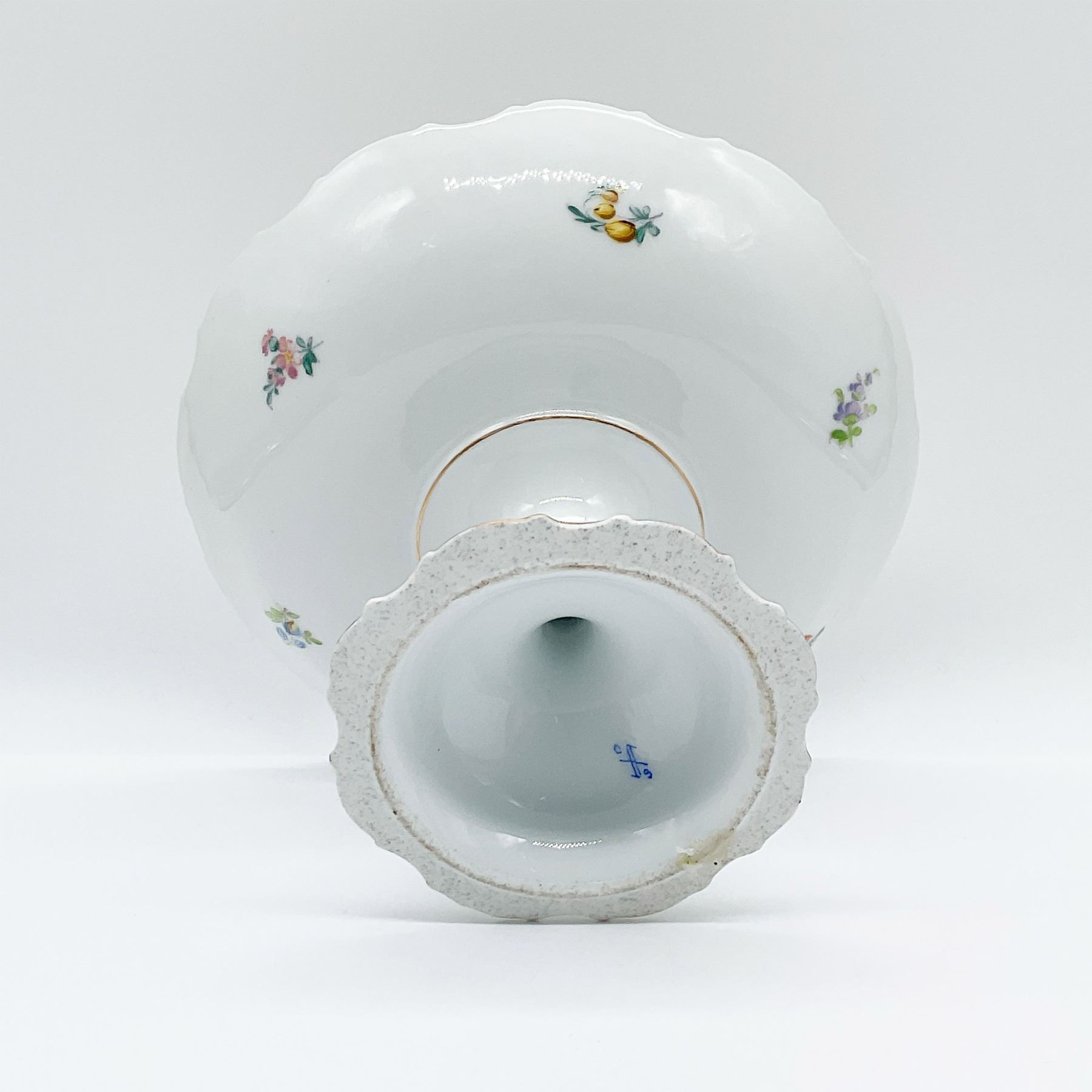 This elegant porcelain compote features a scalloped rim with gold trim and a hand-painted floral motif in vibrant colors. The pedestal base is adorned with complementary floral accents and gilded detailing, creating a harmonious design. Measuring 5.75 inches in height, this compote is ideal for display or functional use. The underside is marked with a blue insignia, indicative of its craftsmanship and authenticity.