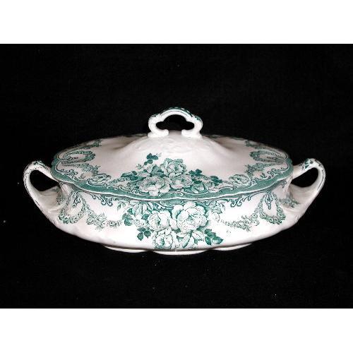 Delicate rose pattern green and antique cream two handled Alfred Meakin covered casserole or vegetable dish comes from England 19th century. The pattern is Derwent as attested on the bottom with name and crown symbol. Raised work surrounds the handle with scalloped lid. Perfect condition. Measures 12L X 8W X 5.5H.