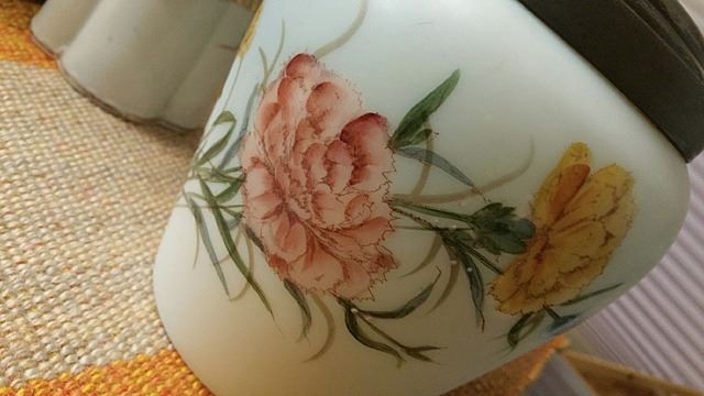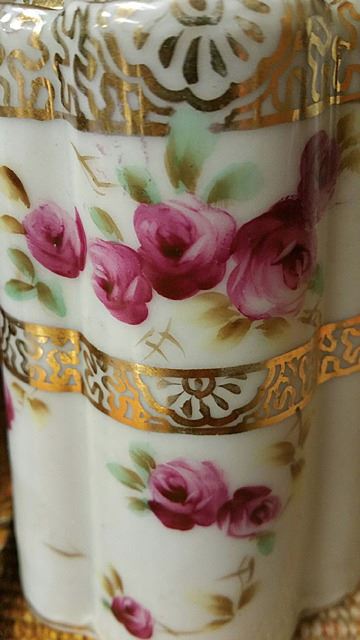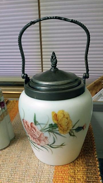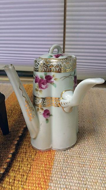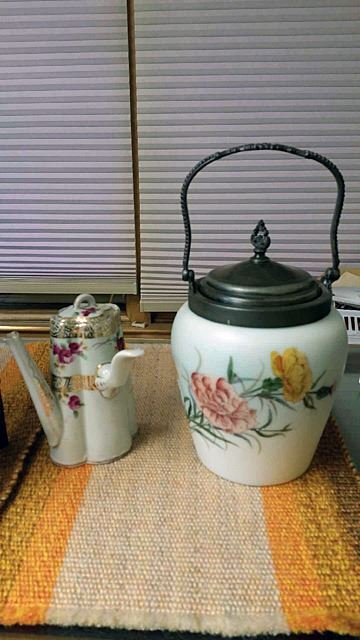 Porcelain covered cracker jar and hand painted Nippon teapot.