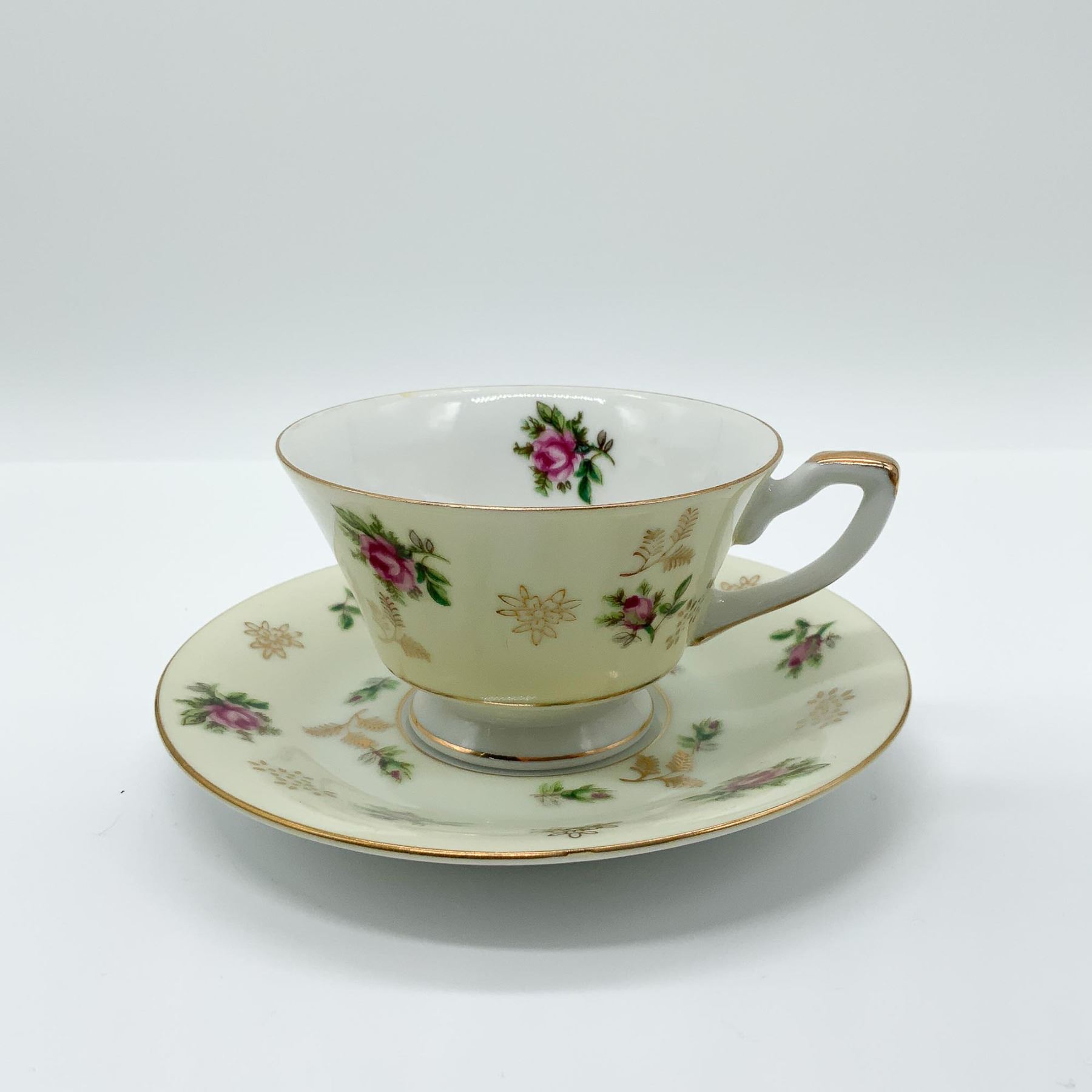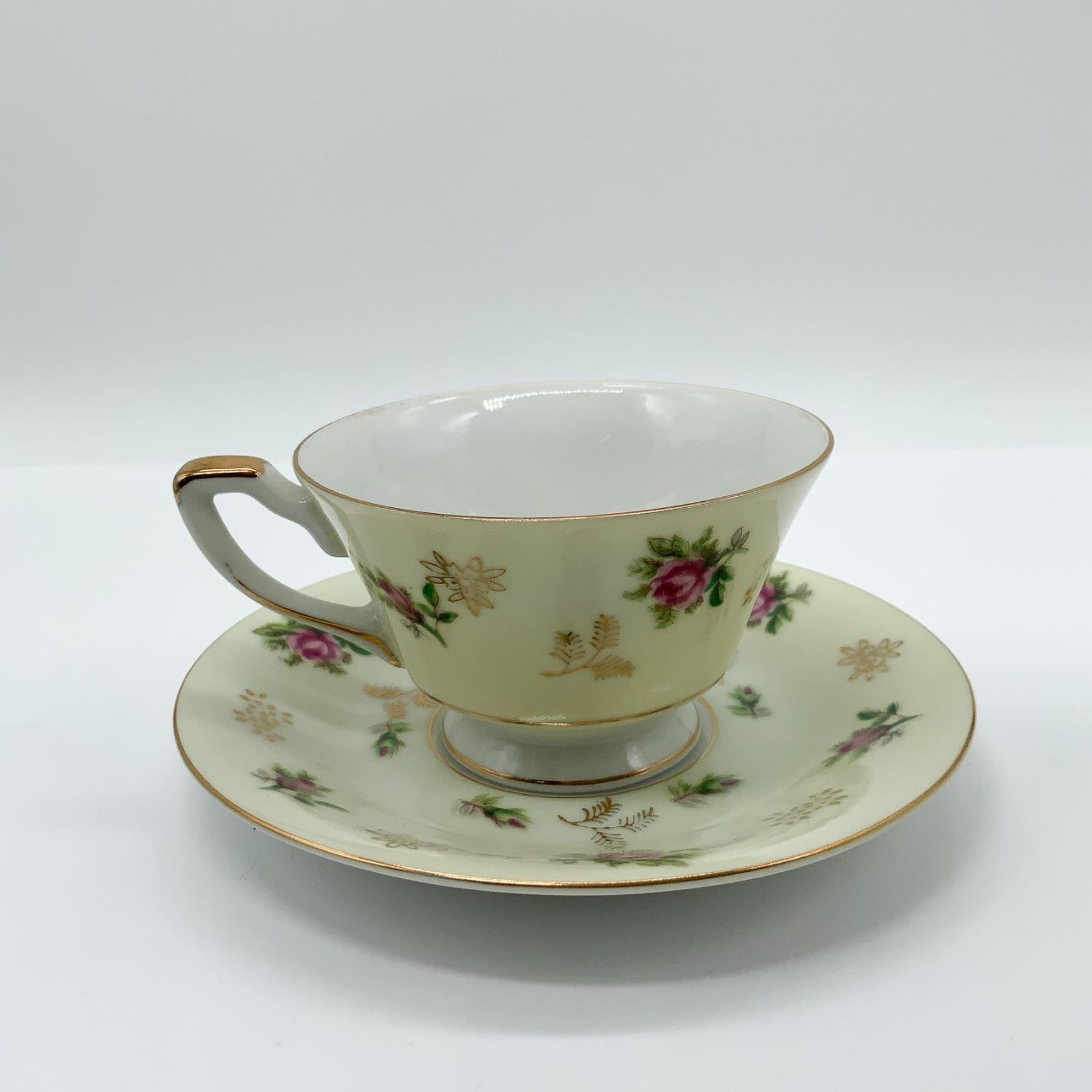 Elegant vintage porcelain cup and saucer featuring a delicate floral pattern with pink roses and intricate gilt accents. The scalloped edges and gilt trim add a touch of refinement, making this set a beautiful addition to any collection. The cup's curved handle is accented with detailing, complementing the floral motif. The saucer mirrors the cup’s intricate design with matching roses and embellishments.