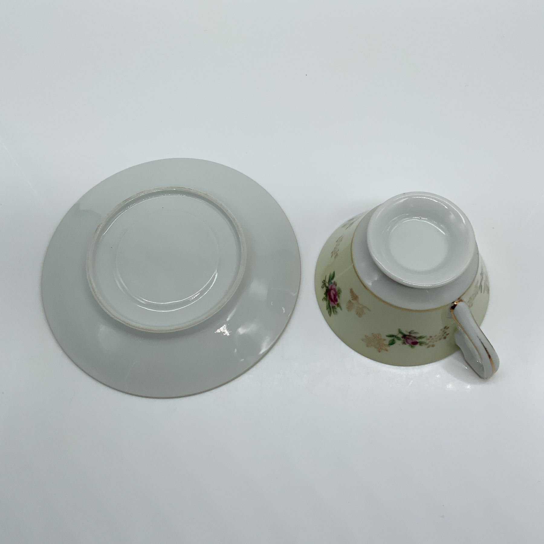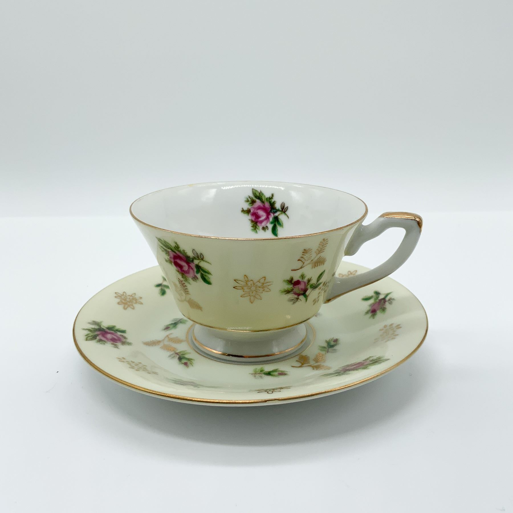 Elegant vintage porcelain cup and saucer featuring a delicate floral pattern with pink roses and intricate gilt accents. The scalloped edges and gilt trim add a touch of refinement, making this set a beautiful addition to any collection. The cup's curved handle is accented with detailing, complementing the floral motif. The saucer mirrors the cup's intricate design with matching roses and embellishments.