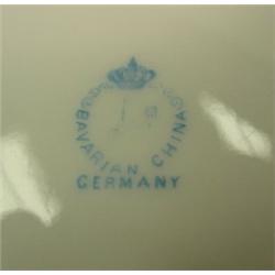 Porcelain dessert plate. Marked Bavarian China, Germany. 0-1/2" wide with floral decals and gold accent. Pierced handles. Condition: Wear on gold edges. No chips or cracks.