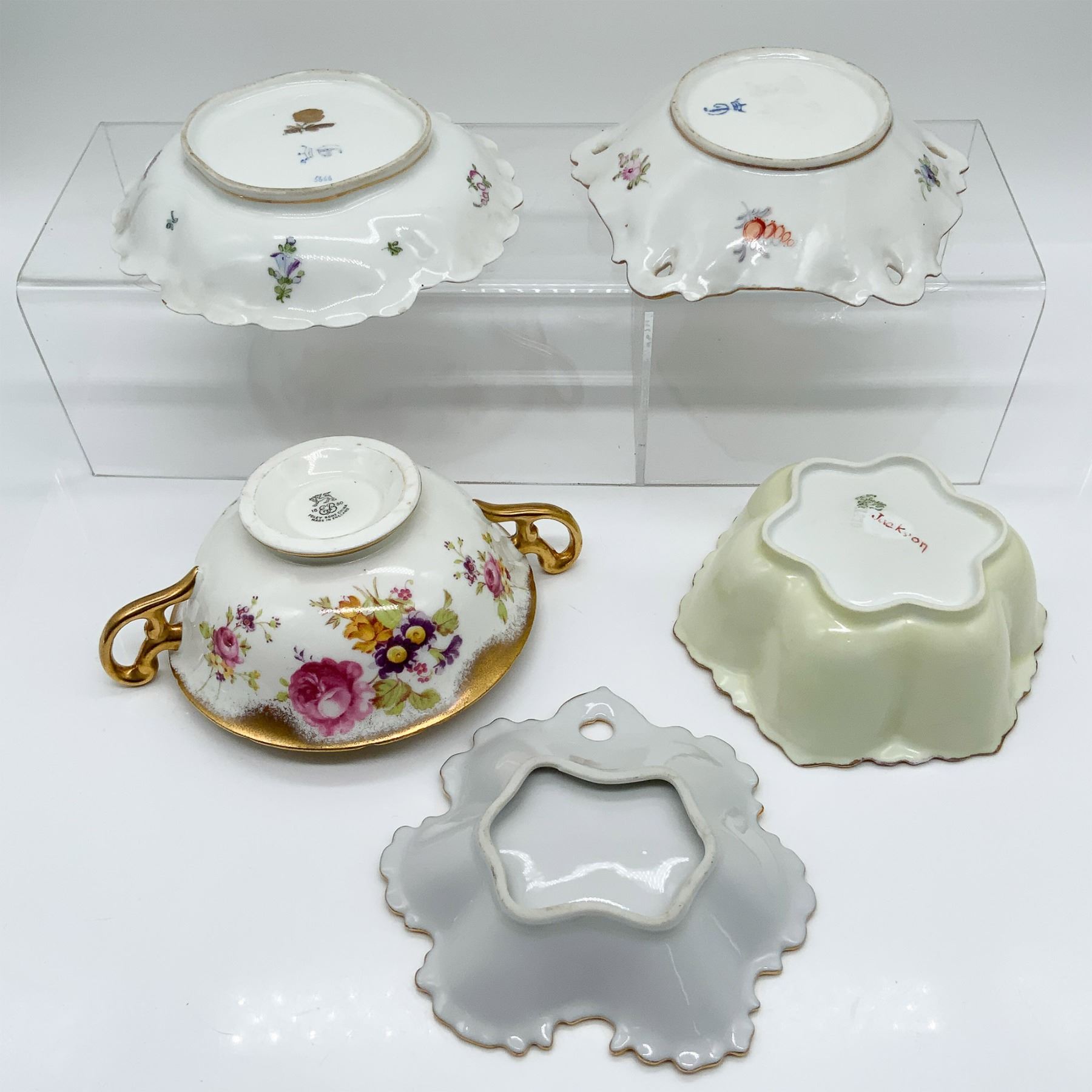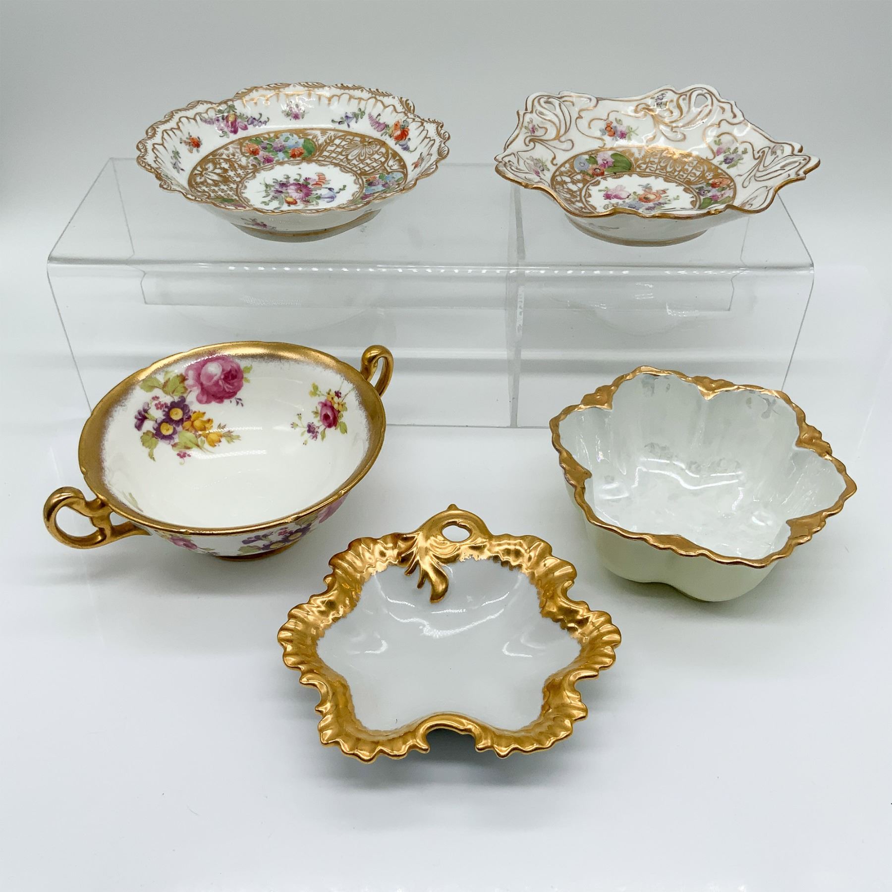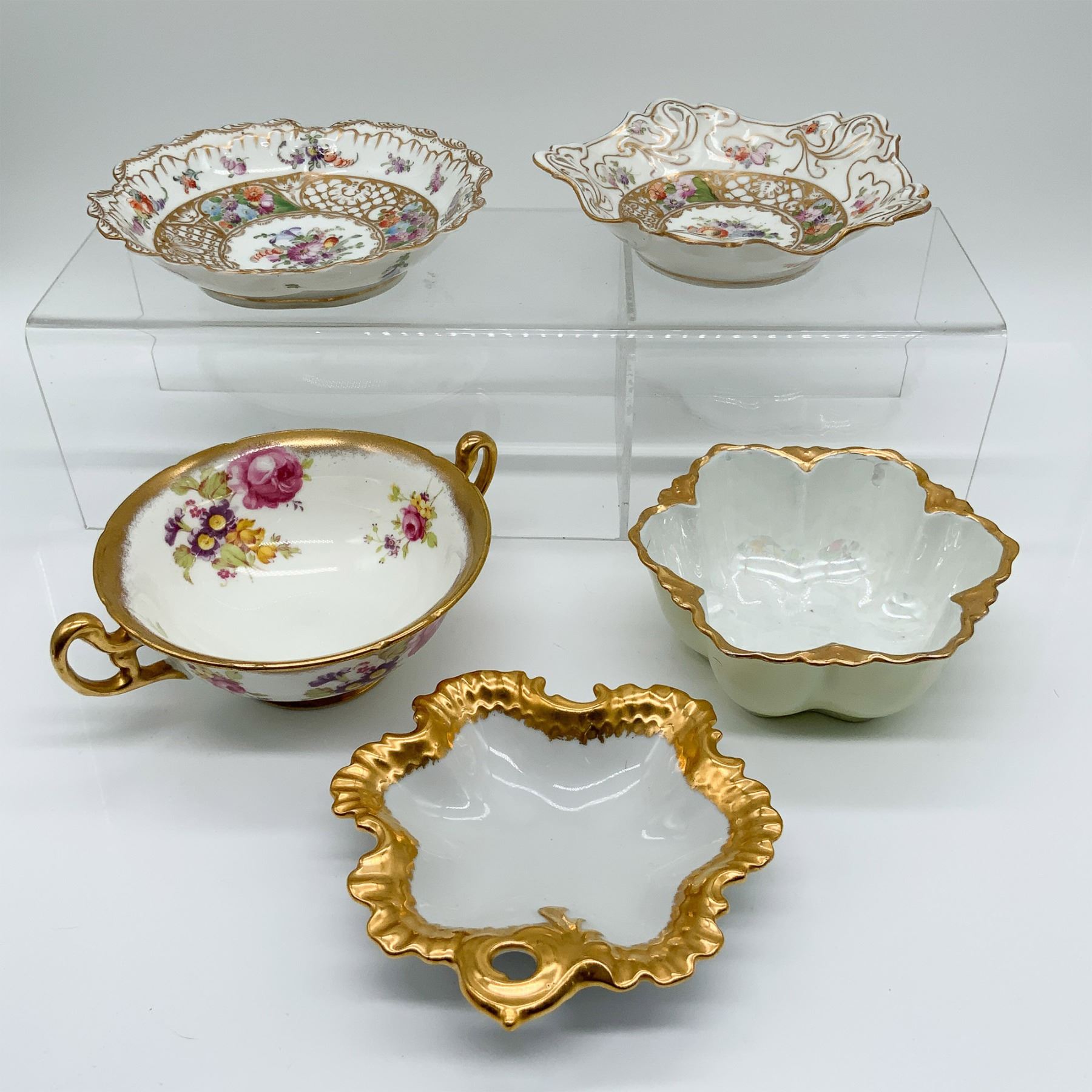 A curated set of five decorative porcelain dishes featuring floral motifs and gold embellishments. Included is a dish backstamped “1850 EB Foley Bone China, Made in England,” showcasing fine English craftsmanship. The set also includes a double-handled bowl with vibrant floral patterns and gilded edges, and a hanging dish with an ornate gold-trimmed design. Each piece features scalloped edges and intricate handpainted details, highlighting their artistry. The tallest item in the collection measures 2.25 inches in height. This lot is ideal for collectors or as an elegant display.