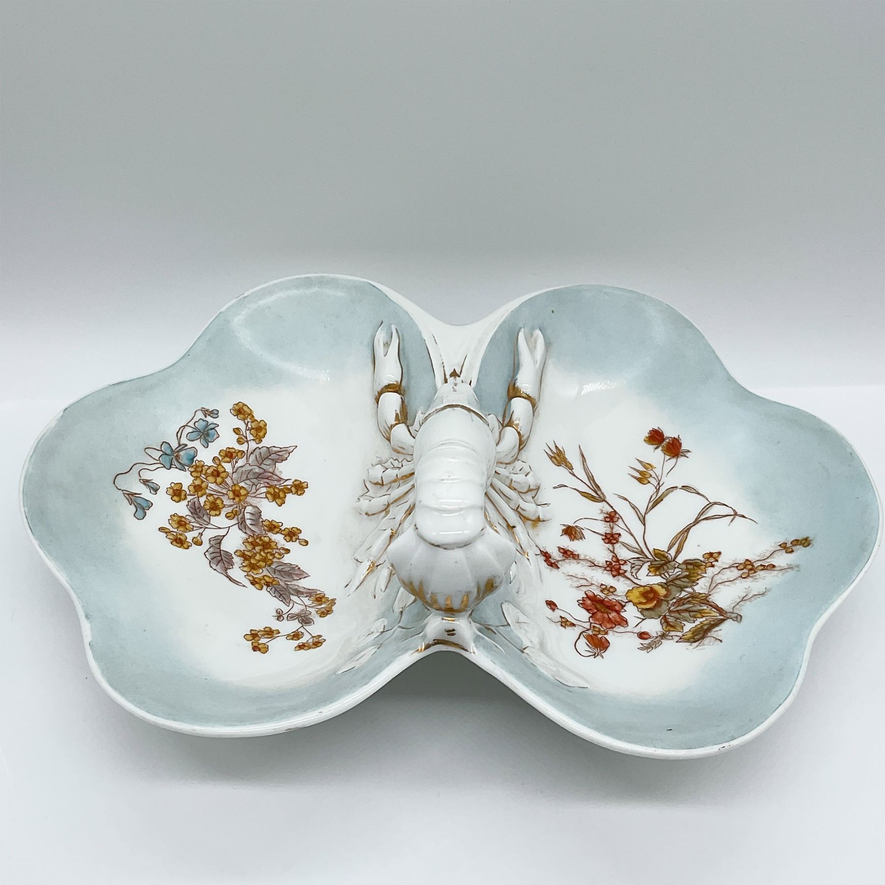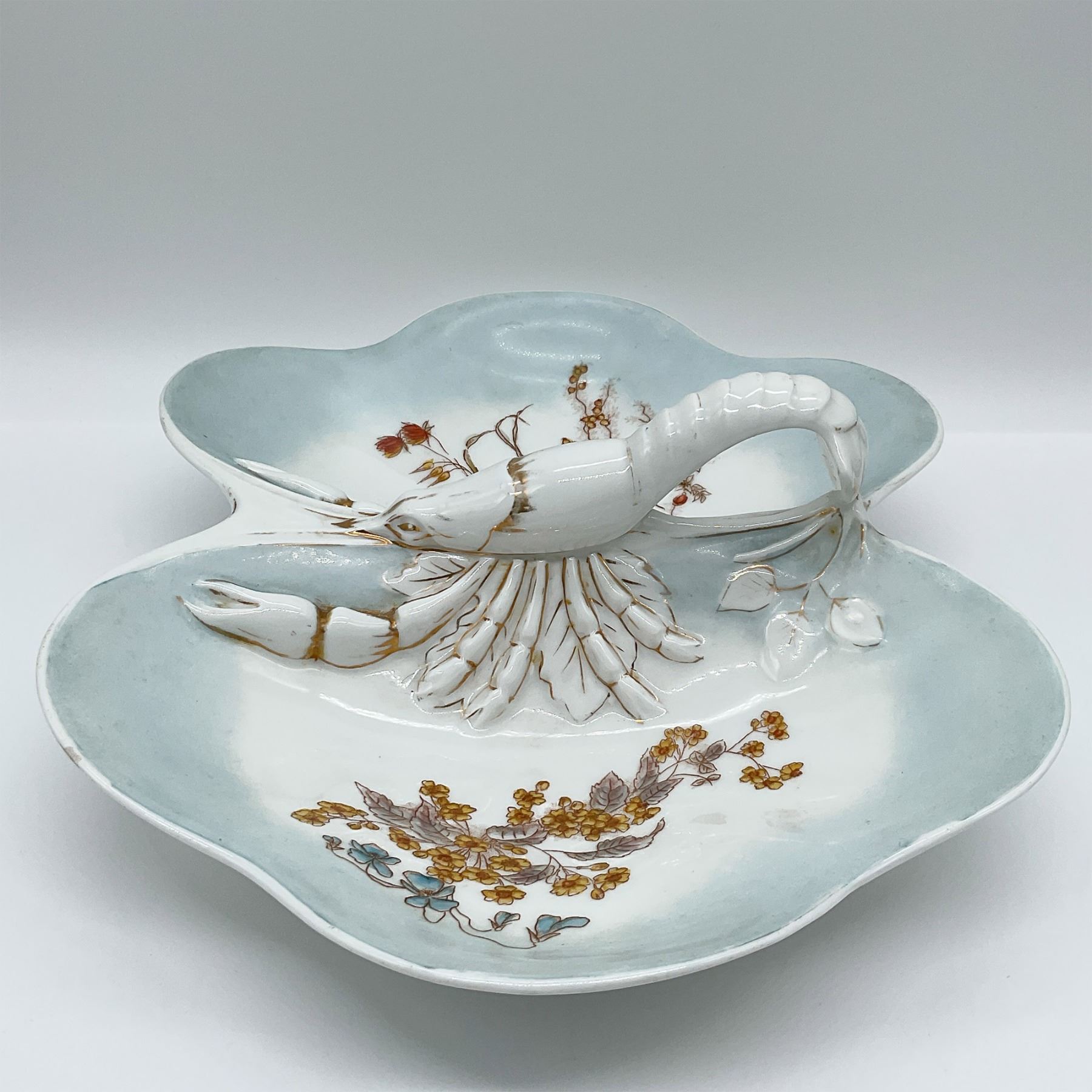 Elegant porcelain divided dish with a central lobster-shaped handle and gilded accents. Features two compartments with handpainted floral designs on a soft blue background. Measures 12.5 inches in length, perfect for serving or display.