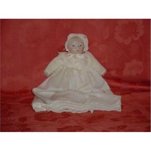 This a signed and dated A. Carter. She is dressed in a 30.5 inch christening gown. The bisque head is hand painted including hair and facial features. She is dressed in a lace trimmed dress, bonnet, layette.