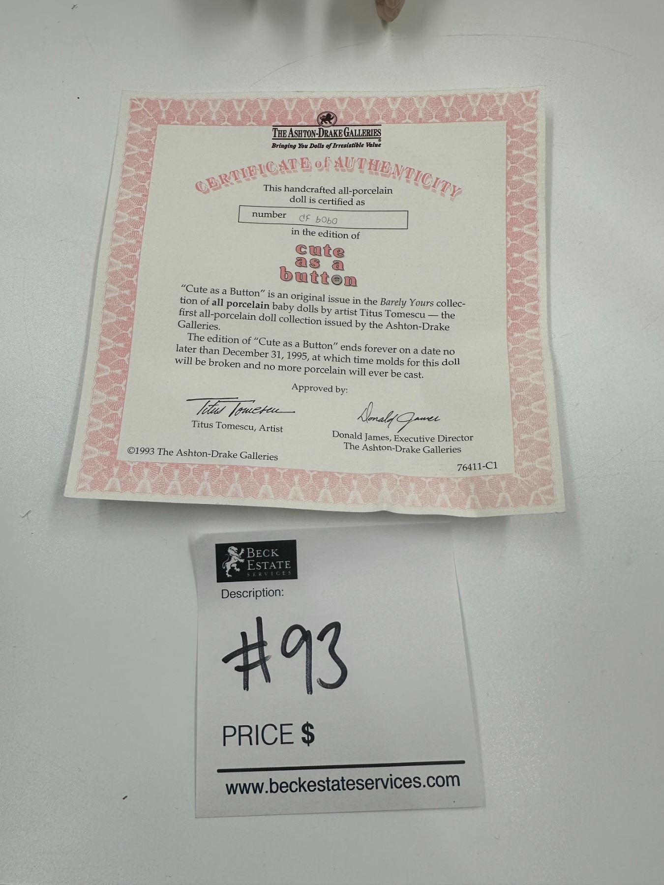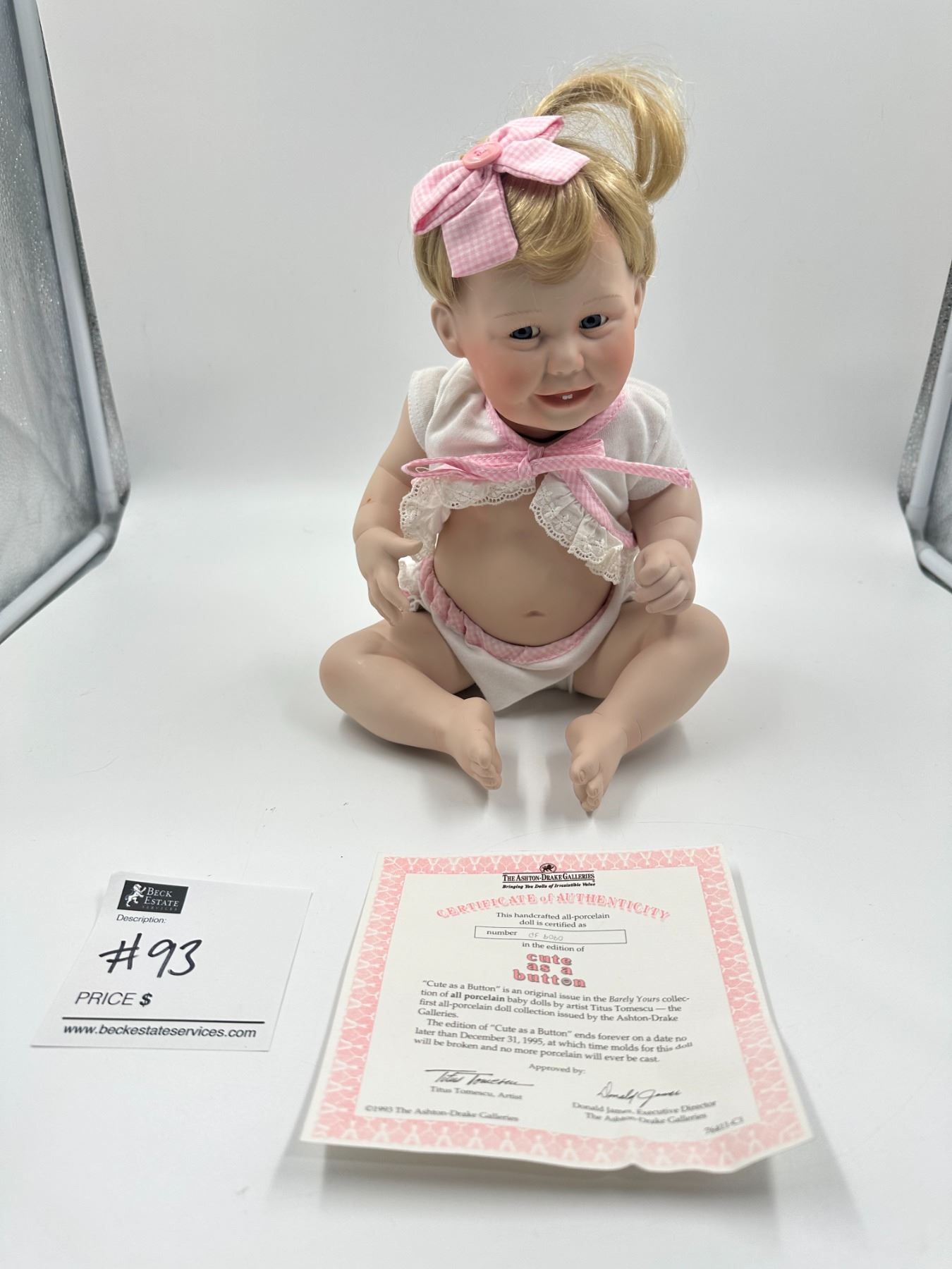 Porcelain doll is 11" high and come with box and certificate.