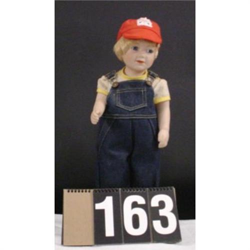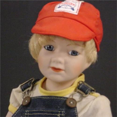 An unmarked porcelain doll of little boy in red cap and blue overalls. Doll is in good condition, porcelain is slightly dirty. Doll measures 16 inches high and weighs 2 lbs. [149]