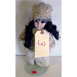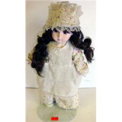 This doll is approximately 12 inches . This doll has long dark brown hair and big brown eyes. She has a porcelain head, hands and feet with a cloth body. She is dressed in a white dress with pink fllowers with a matching hat. She is also wearing a white apron. She has on lace trimmed pantaloons and white tie shoes. She has her own stand. Good condition