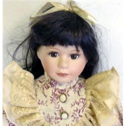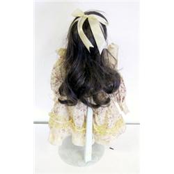 This pretty porcelain doll stands 17 inches. She has long dark brown hair and brown eyes. She is wearing a 19th century cream colored and mauve print dress with petticoat and white buckled shoes. She has her own stand and is in good condition.