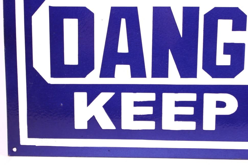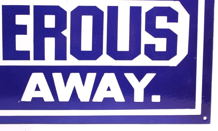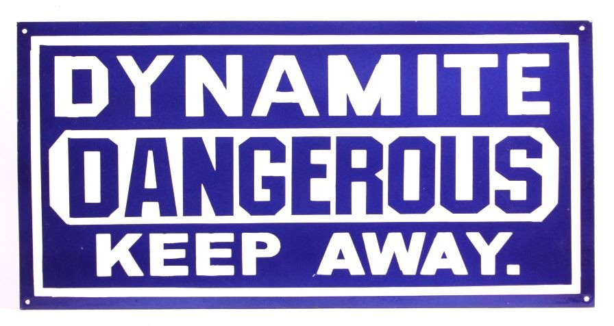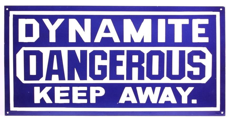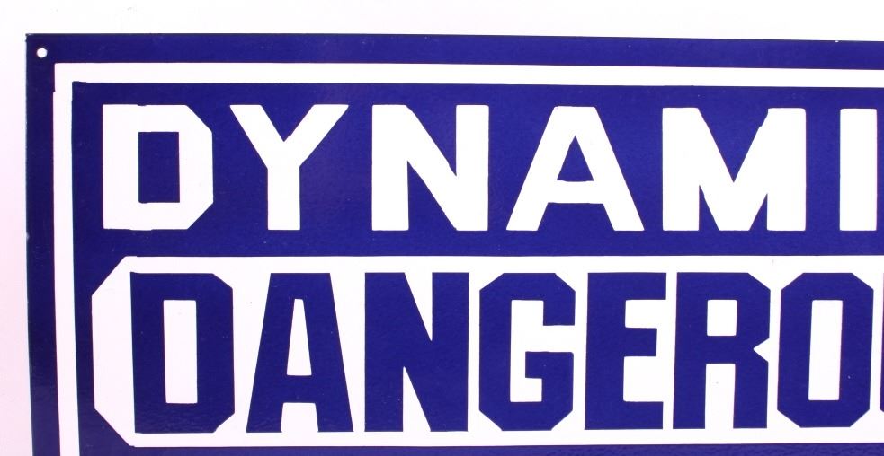 This is an original porcelain dynamite sign. The sign reads "Dynamite Dangerous Keep Away." The sign shows good overall condition with little to no wear. The sign measures 12" x 24".