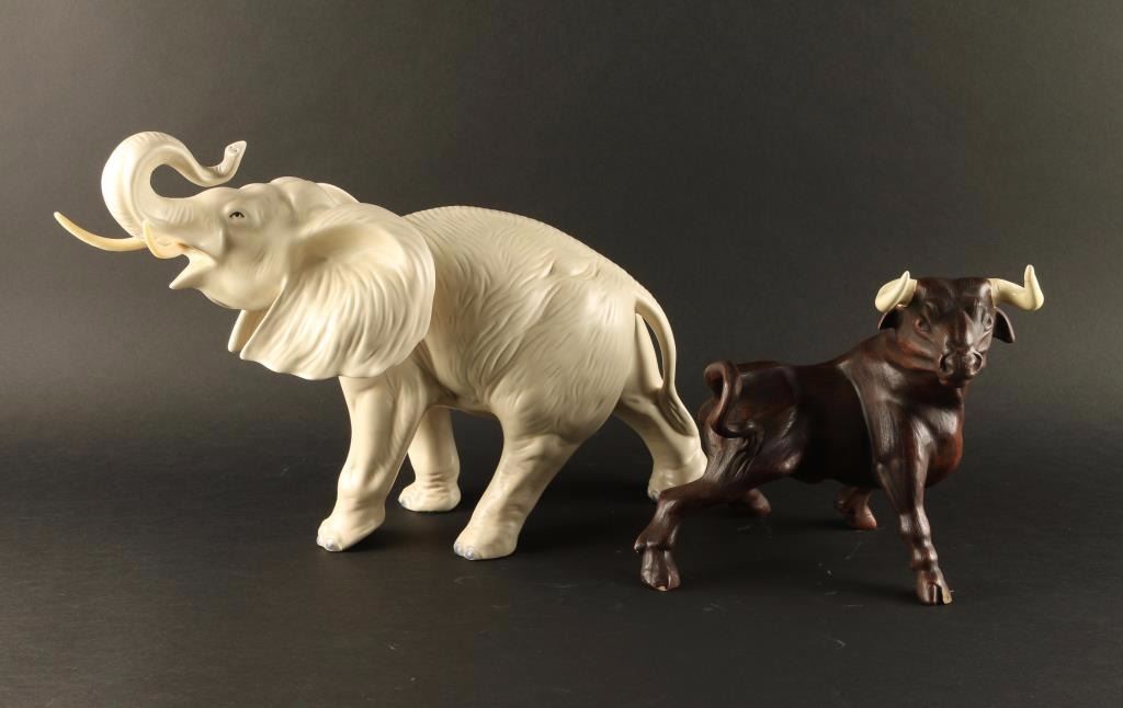 All white male elephant made in Mexico. Measures 13"x17". Brown porcelain bull with white horns which have been repaired, leg has also been repaired.