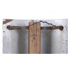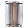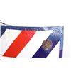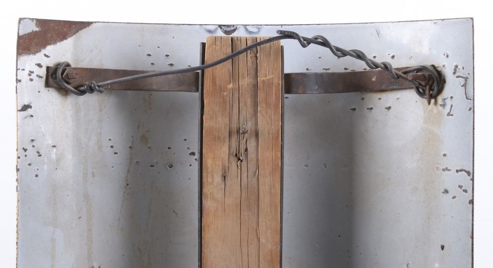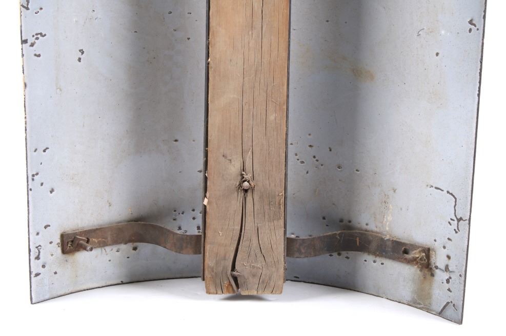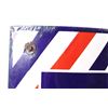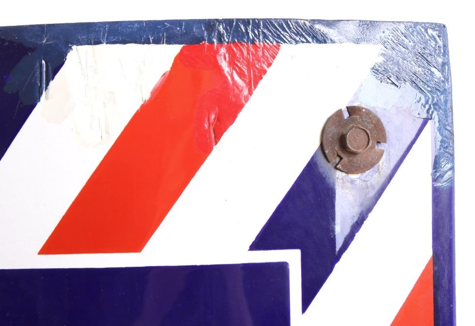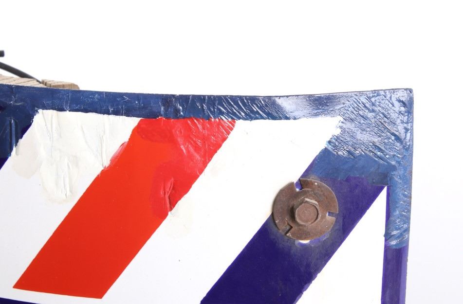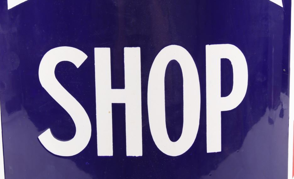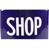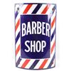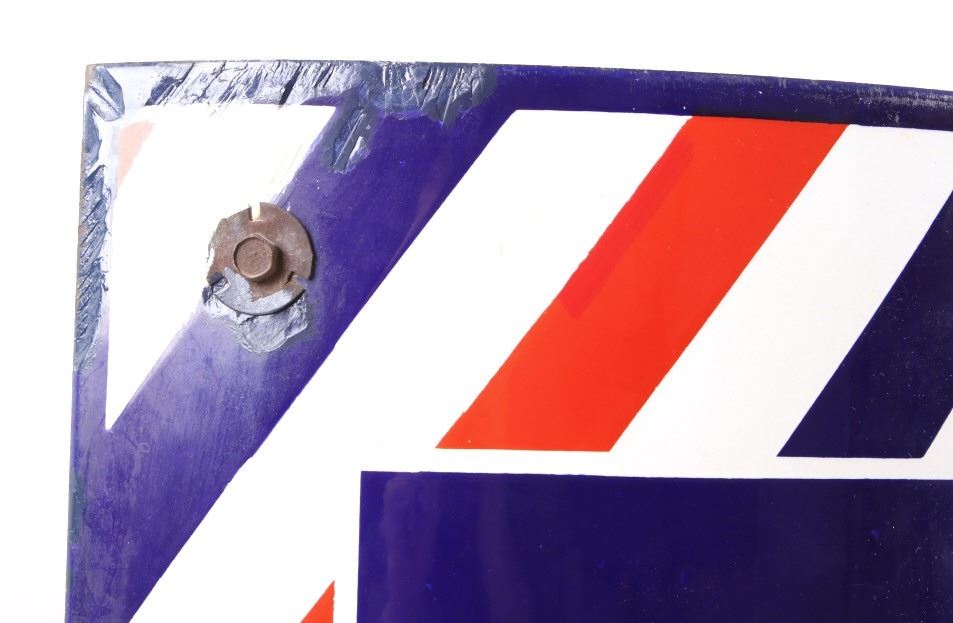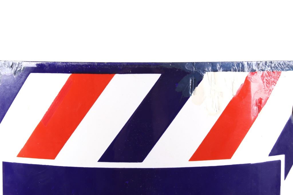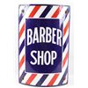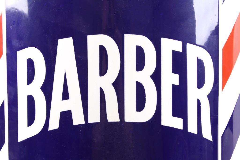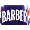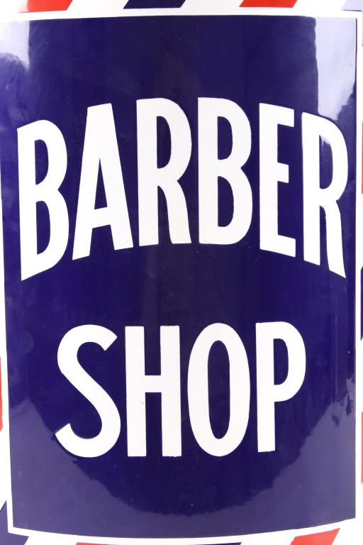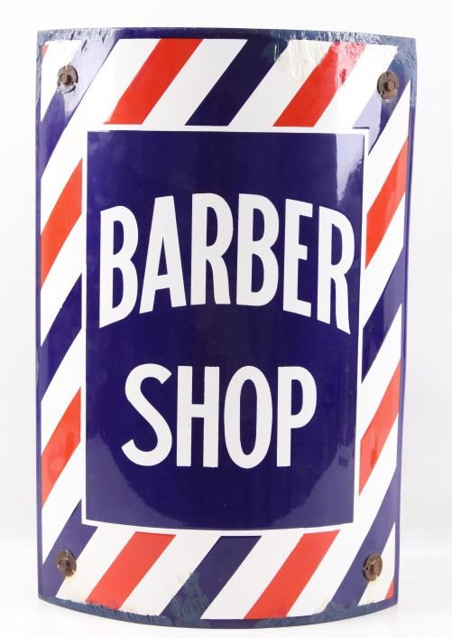 For your consideration is a porcelain enamel Barber shop advertising sign. This porcelain sign shows a curved design and bold lettering. The sign has vibrant red, white and blue diagonal stripes and a blue background for the lettering. The sign reads “BARBER SHOP”. Four bolts attached a vertical support to the back of the sign which allows it to be mounted to any flat surface. The sign shows fair condition for its age with a few blemishes along the top that have been repainted. The sign measures 16” x 4” x 24”.