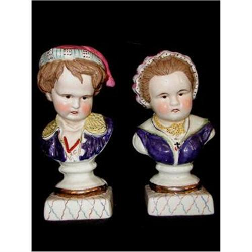 Adorable pair of European hand painted busts,boy and girl,have no markings but are extremely detailed. Rosy cheeked with deep set eyes and cherub mouths. Both on antique cream bases with deep red and blue design. Boy dressed in deep blue jacket with yellow collar,blue and brown designed. His stocking hat in rosey pink with green floral design and brim in seafoam green and brown with gilt accents on all. The girl dressed in blue dress with cream colllar and green trim and yellow scarf. Wearing a blue crucifix on gold chain. Her hat is rose with green and brown and ties in the back. Gilt accents as well. Both have the same color brown hair. In excellent condition, no nicks,chips or cracks. Measure 8.5H X 4.5L X 4D.