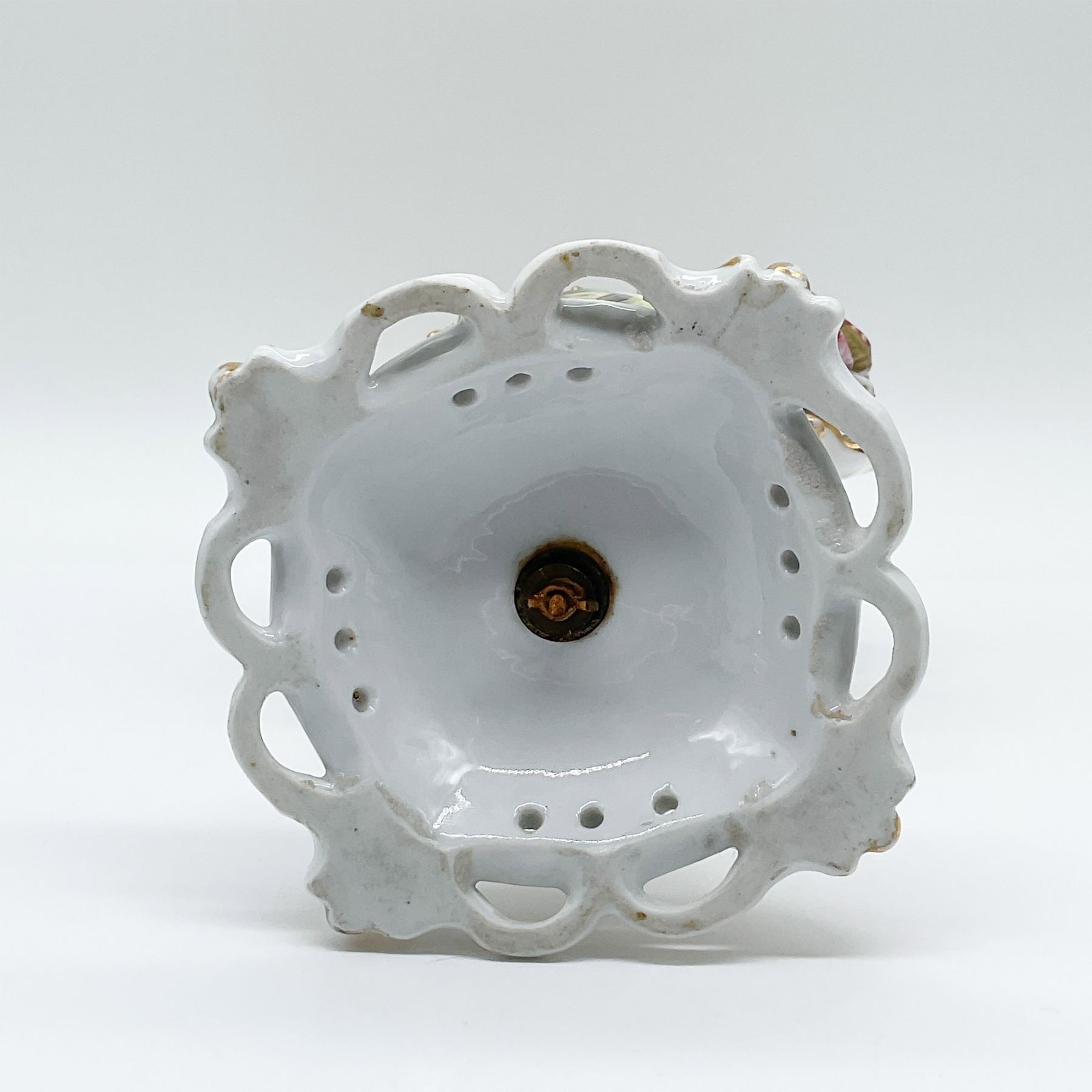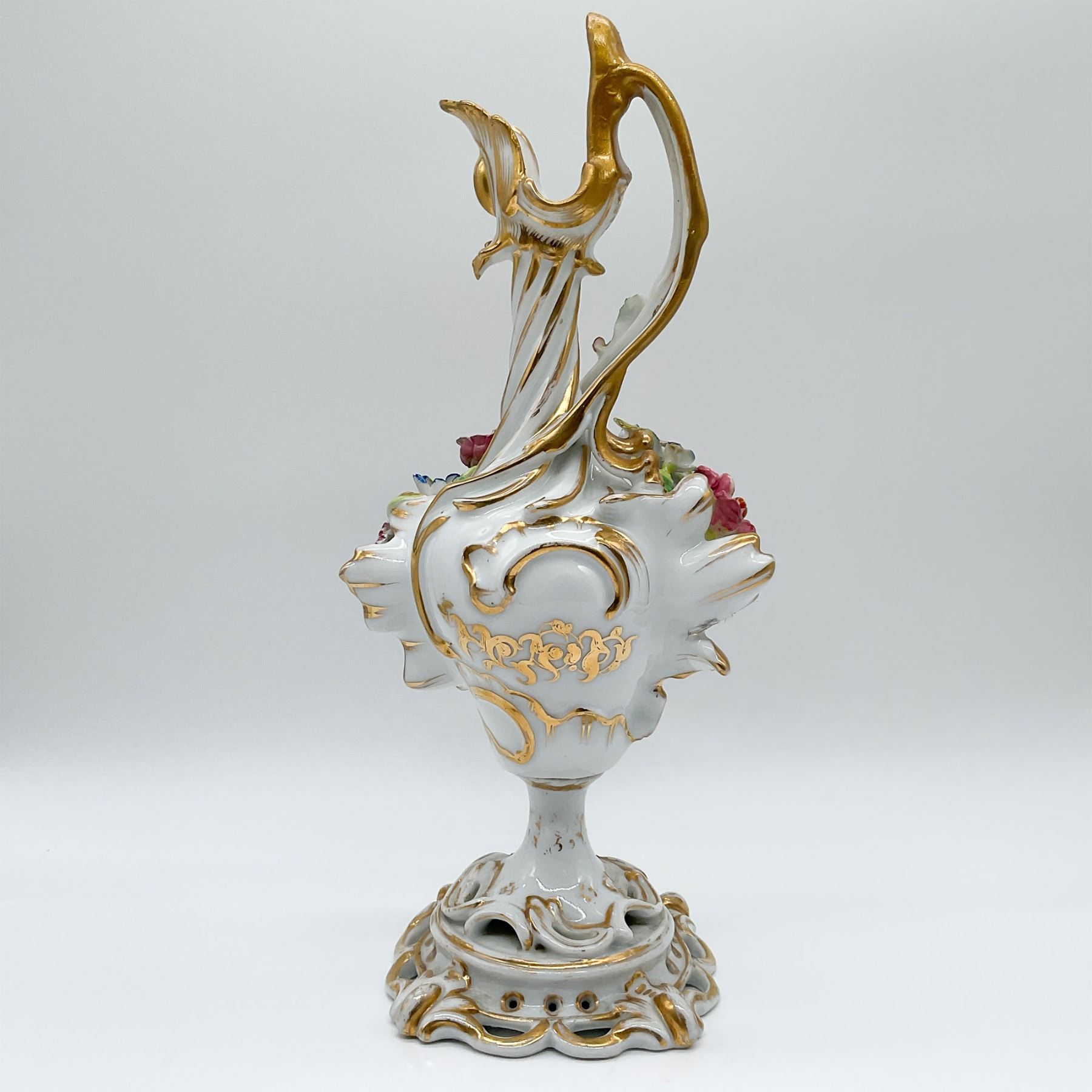 Elegant porcelain ewer with Rococo-inspired design, gilded accents, and applied floral decorations. Features a central vignette with an open book and lute motif, scrolled handle, and openwork pedestal base.