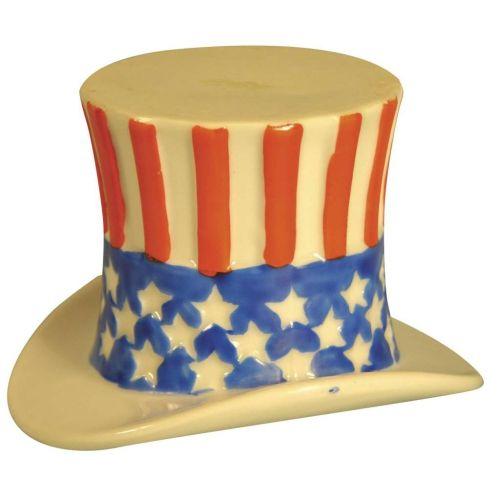 Porcelain Match Holder in the shape of Uncle Sam's Hat. No chips or cracks, excellent condition. 4 X 2 1/2 X 3 1/2 inches.