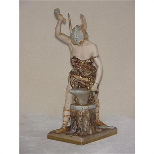 A porcelain figure modeled as a Viking working at an anvil. Probably Japanese, the figure is 12" tall and stands on a 4" X 6" base. Condition: small chip on powder horn worn at figures' waist.