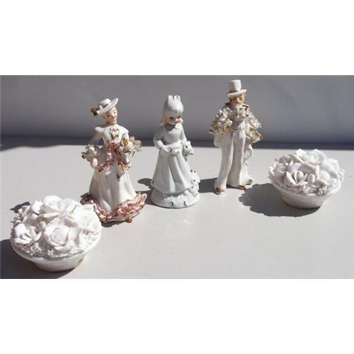 This lovely collection will grace your home with style. Three porcelain figurines made in the Meissen-style and marked Japan on the bottom of the colonial man and woman. The man is 5 ½? high and the woman and girl are each 5?. All are in perfect condition with no chips, cracks or repairs. To complete this set we have two porcelain candleholders that are shaped like bouquets of white roses. When not in use they are beautiful bouquets and when you wish to put candles in them the center rose lifts out. They are marked on the bottom with 6236 and a silver foil label but the makers name has worn off. They measure 4" wide and 2 1/2" tall. One of these holders has the interior bottom broken but you can not see it and it does not keep the holder from working properly.