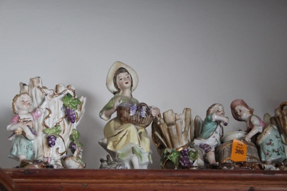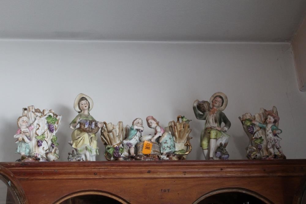 Porcelain figurines, collection of 5. Separate woman and man holding baskets of berries, and 3 seperate statues of children picking them.