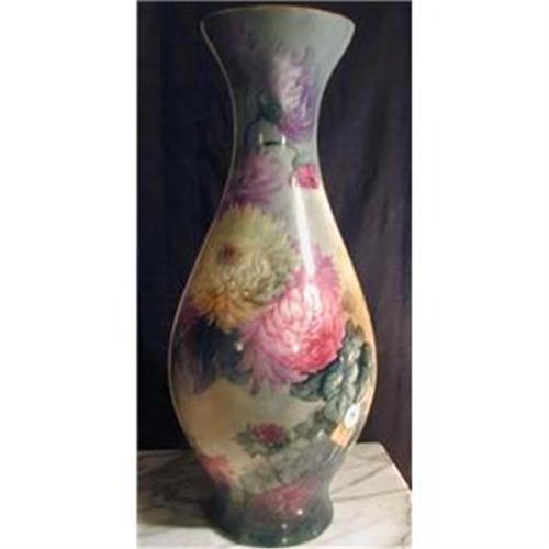 Beautiful floral vase of chrysanthemums. It is 5.5" in diameter at top and bottom. At 20" tall, it would be magnificent on a table in a spacious foyer. Signed _ Howspy.