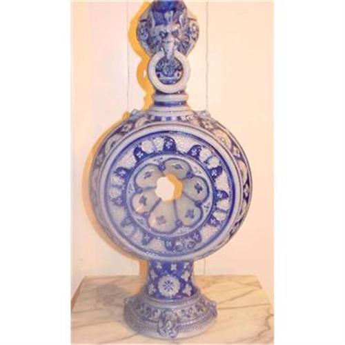 Price reduced. Very stately blue and gray German beer pitcher. 10" across widest part. Lion heads adorn the bottom of the base. No chips or cracks. Price has been reduced!