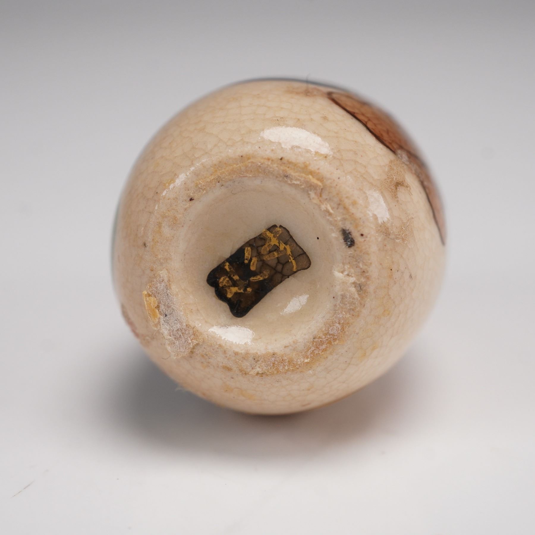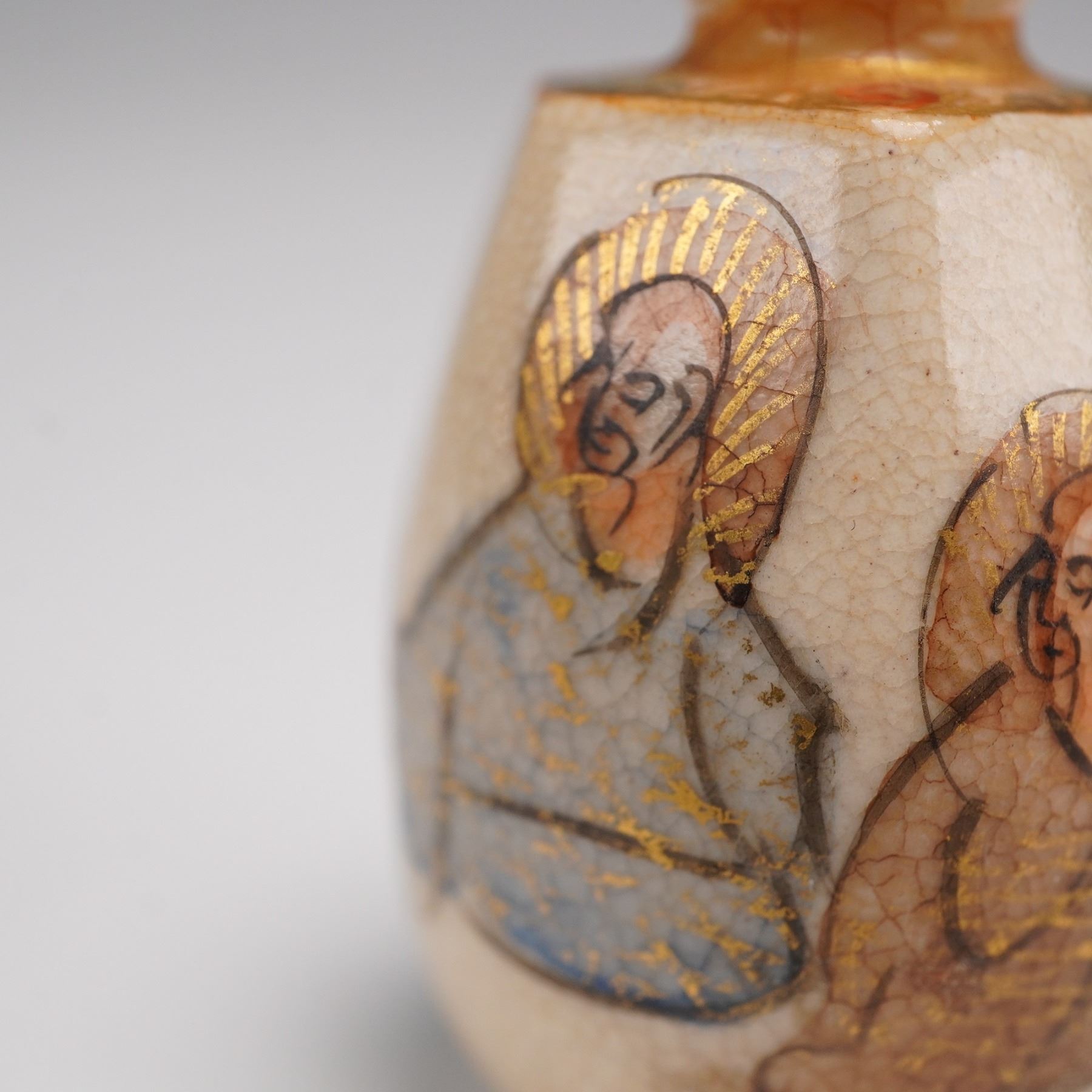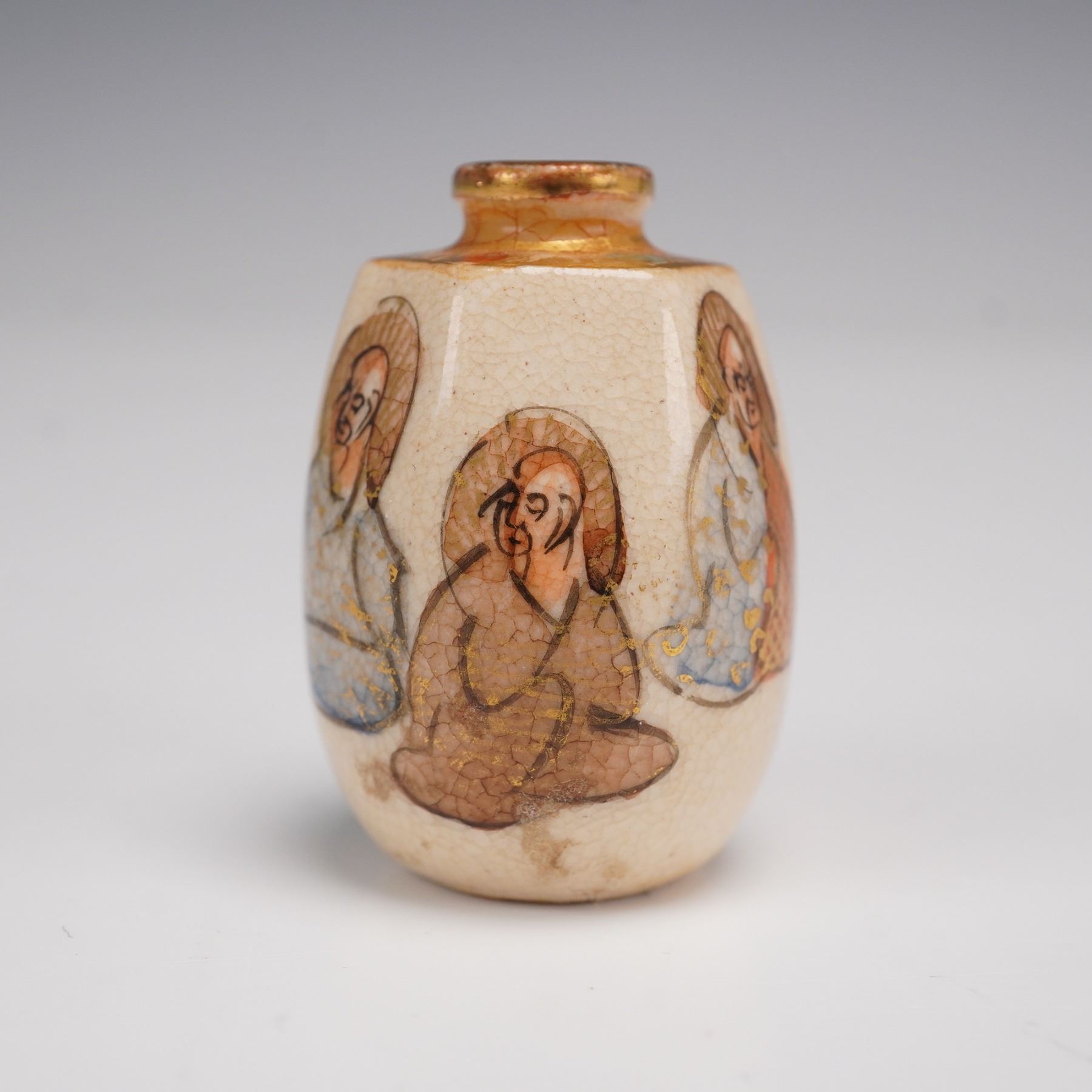 A finely detailed porcelain snuff bottle decorated in the Satsuma style, featuring hand-painted Buddhist figures with intricate facial expressions and gilded accents throughout. The body shows a distinctive crackle glaze, a hallmark of Satsuma-inspired wares, with gilt embellishments around the neck and decorative borders. The warm tones of gold and earth colors enhance the delicate artistry, making this piece both collectible and decorative.
