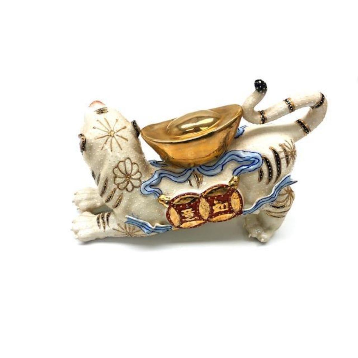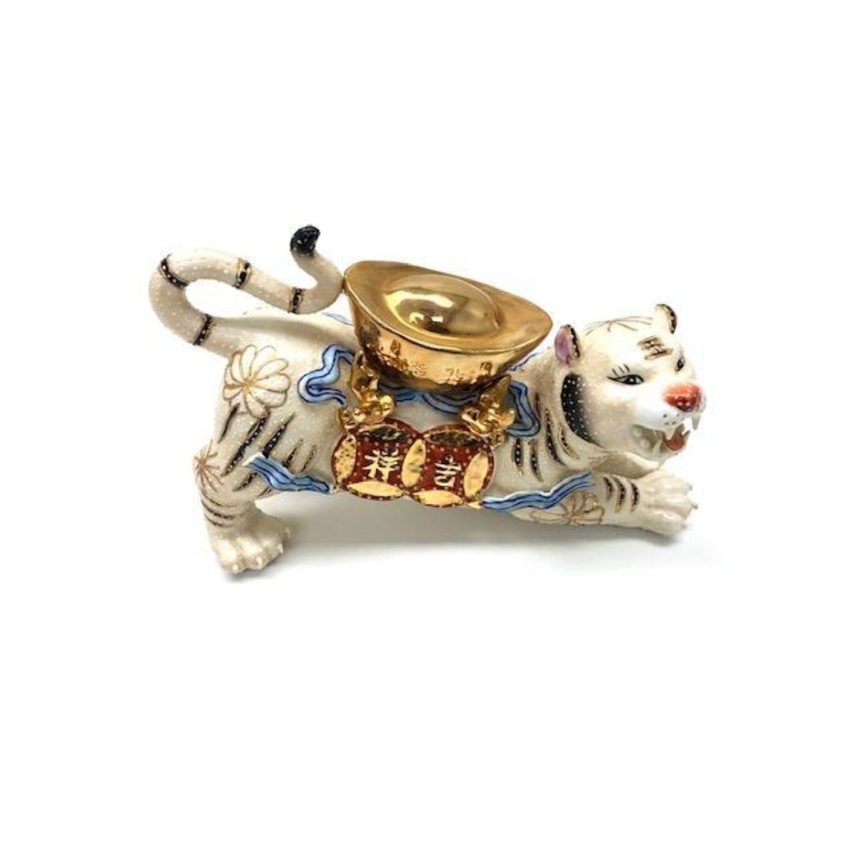Porcelain Hand-Painted Chinese Tiger With Gold Painted Ingot On It's Back. 7" Tall, View Photos For More Details.