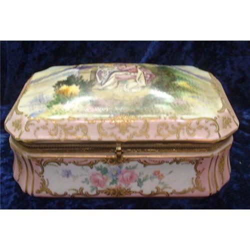 This is a large porcelain china dresser casket with a brass or gold toned frame and hinged lid. It has pink and raised gold painting around the edges and sides of the bow, panels of transfered flower decorations on the sides and the inside of the lid and box, and a hand painted over transfer scene of a courting couple in a beautiful landscape scene. The painting is signed R.Covlory. I know that signature has been found on Sevres pieces. Unfortunately, this box is not marked on the bottom except for a gold triangle. I believe it is French from the 19th century. The casket is 10 3/4" wide, 6 3/4" deep, and 5 1/2" tall. It is in excellent condition with some roughness around the inner rim of the lower part when you open the box.<p>Shipping and insurance in the U.S. is $19.30 for this item. Insurance is required for this item. You can save on shipping by purchasing multiple items. Please wait for me to send you revised shipping costs if buying more than one item. Thank you for your business!