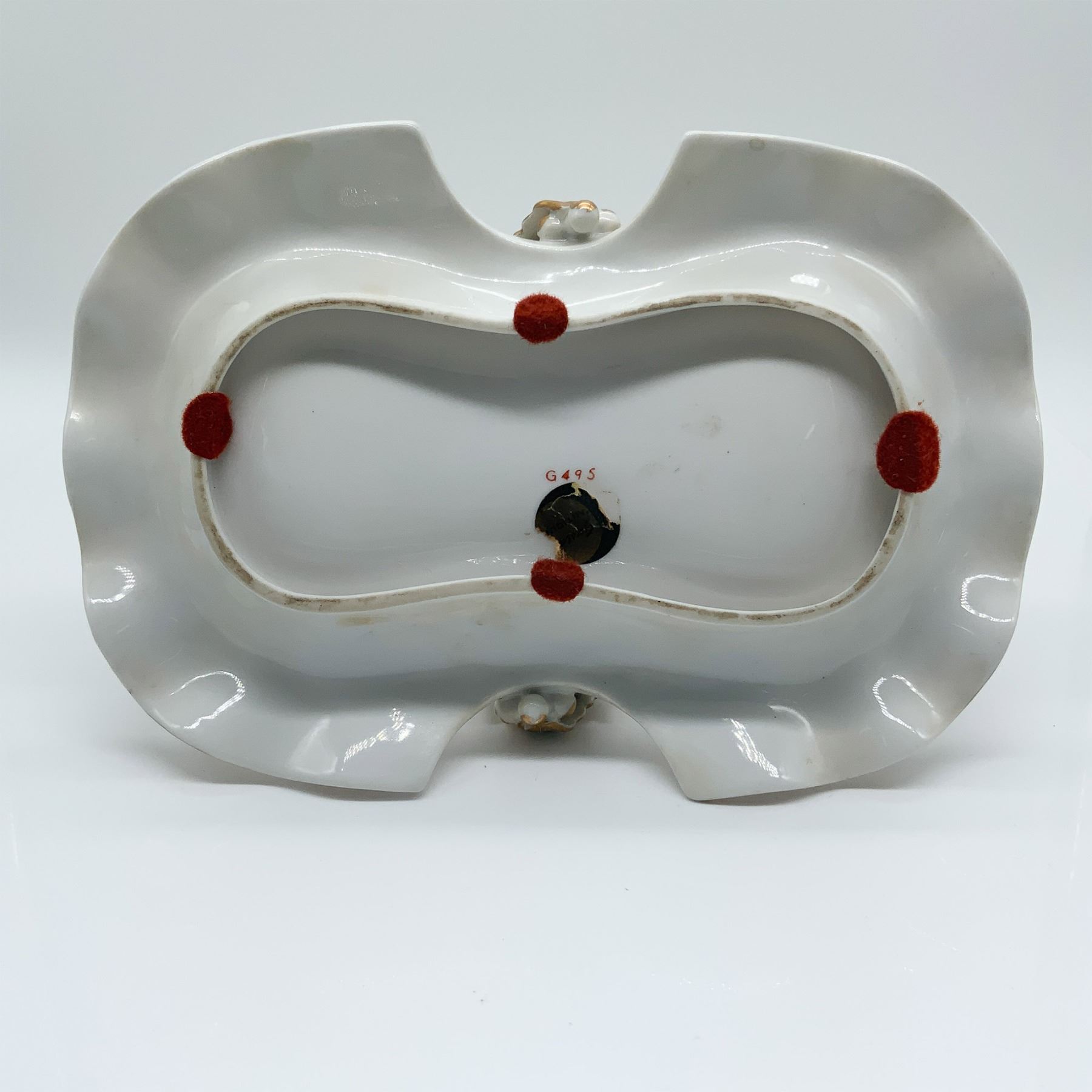 This elegant porcelain handled dish features a hand-painted floral motif complemented by intricate gold gilt accents. The scalloped edges and ornate handle, adorned with a leaf design, add a touch of sophistication to the piece. Measuring 3.5 inches in height, this dish is both functional and decorative, perfect for serving or as a statement piece in a collection. The underside is marked "G495," indicating its unique designation. A beautiful example of fine porcelain craftsmanship with classic decorative appeal.