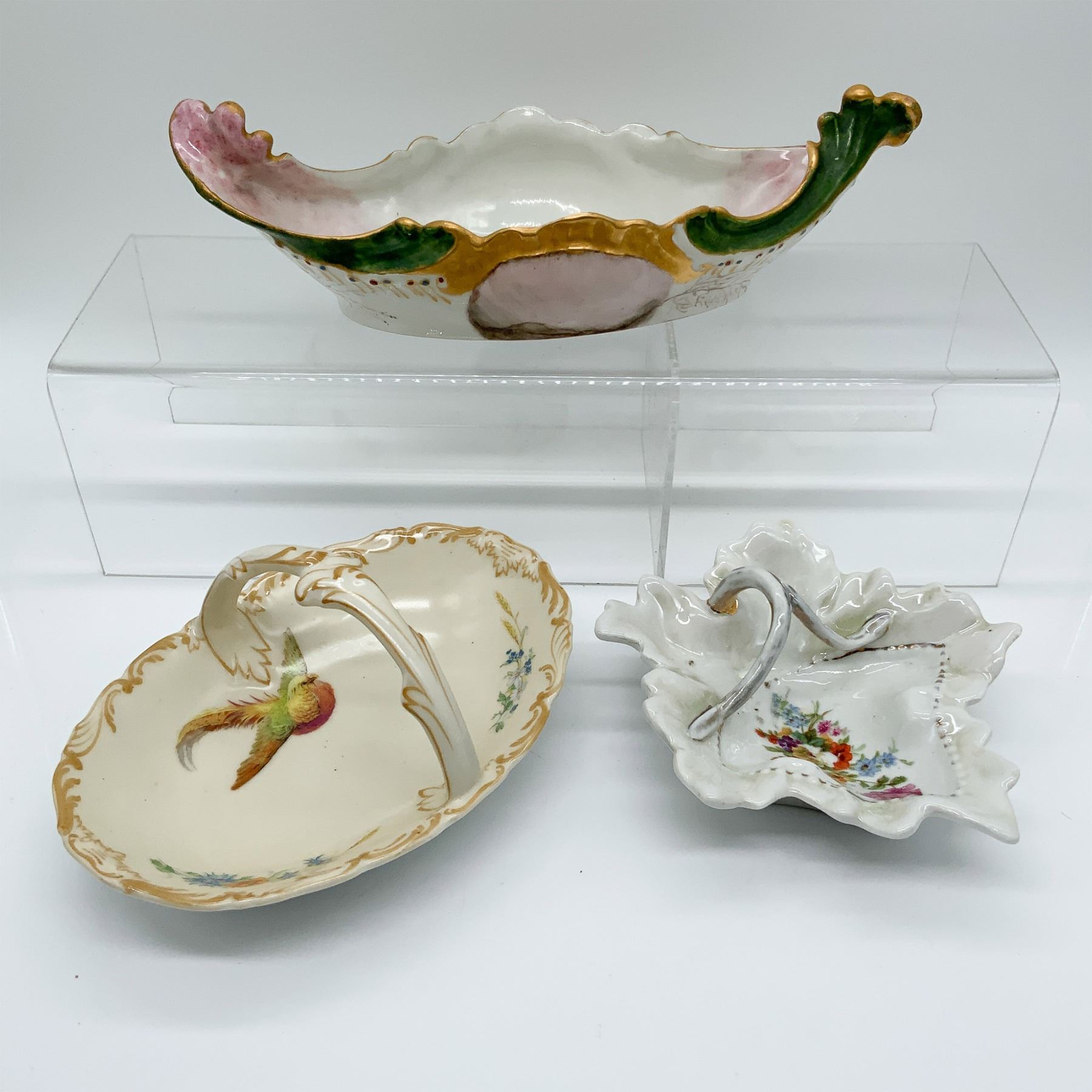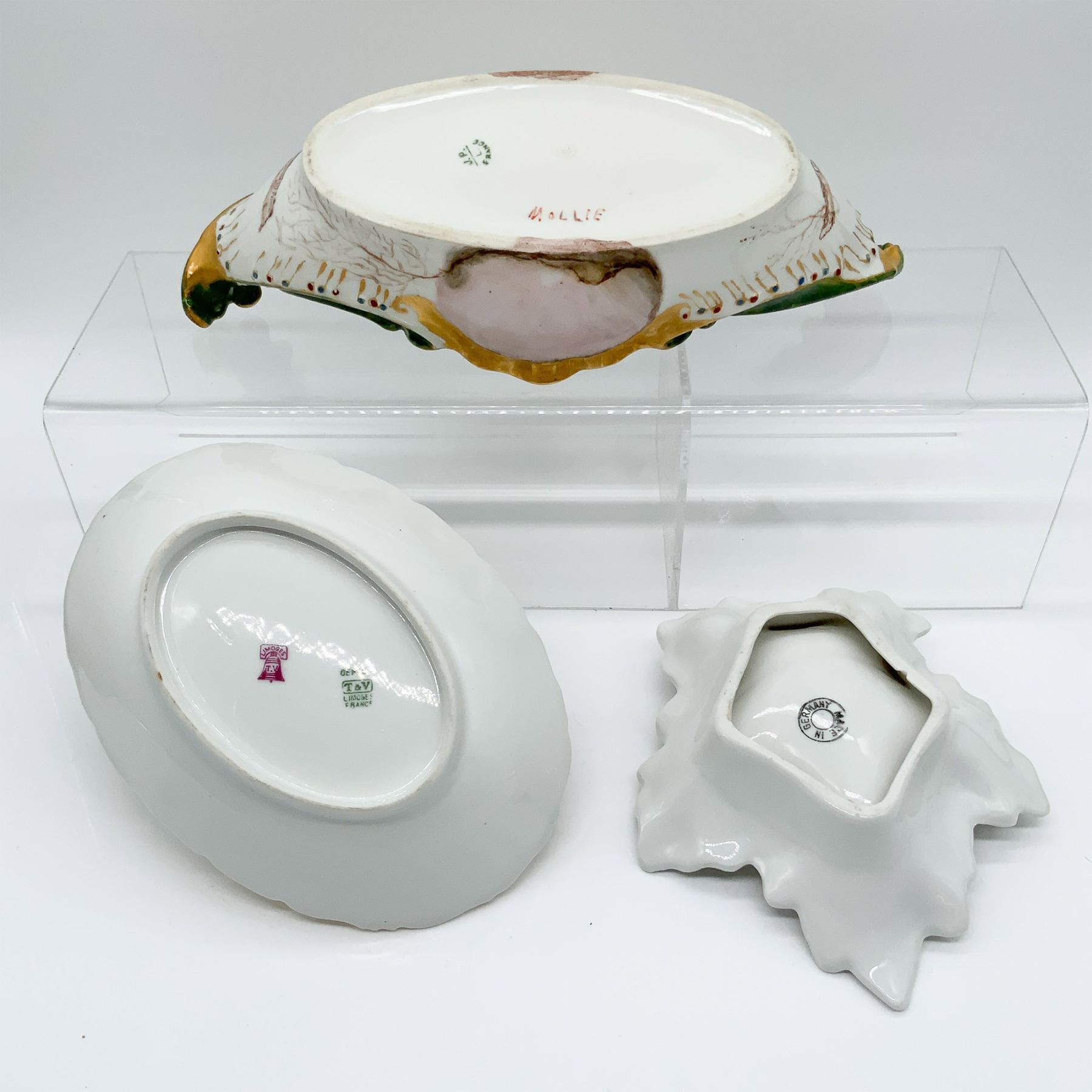 A collection of three porcelain handled dishes, each showcasing hand-painted floral motifs and gilded accents. The lot includes a long handled bowl, measuring 10.25"L, with vibrant green and pink detailing, marked "JP L France," alongside a smaller handled dish marked "T&V Limoges France" and another marked "Made in Germany." These elegant pieces exemplify fine European craftsmanship and artistry, making them ideal for collectors or decorative use.