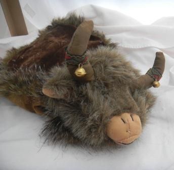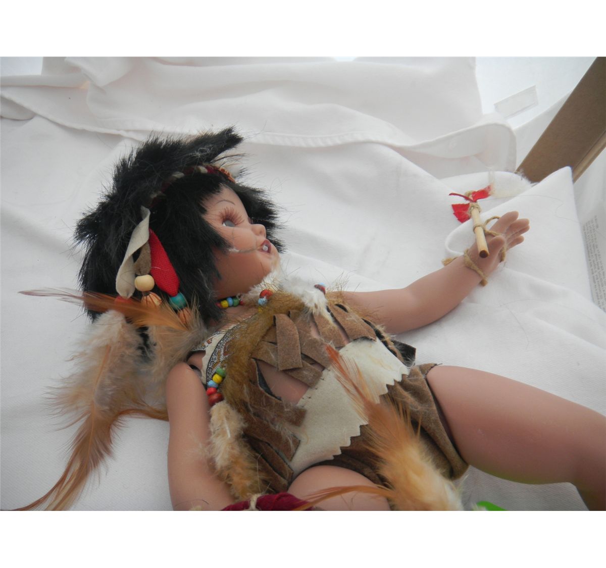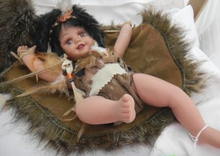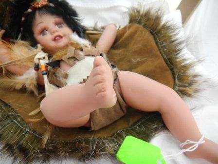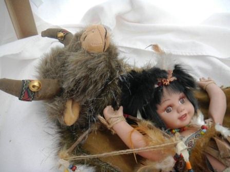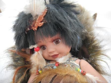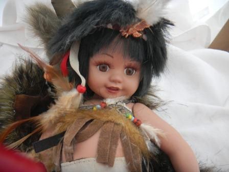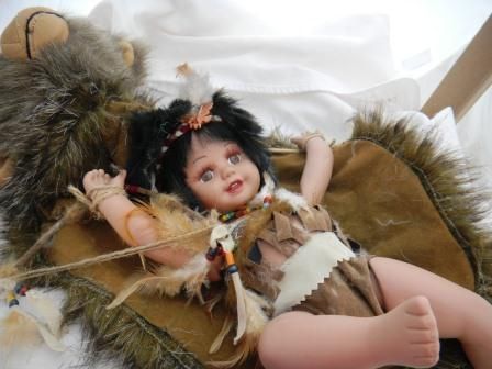 Porcelain Indian jointed doll by Duck House, This is a numbered doll. The doll is 13 x 5 inches and she comes with a simulated buffalo skin. Please note the bow and arrow, all the beadwork, the fancy eyes and eyelashers. Great collectors item. Shipping $20.00