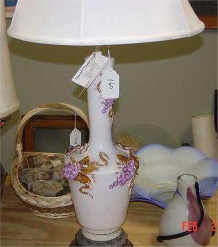 Porcelain Italian table lamp with gold leaf & grape motif, 35" h