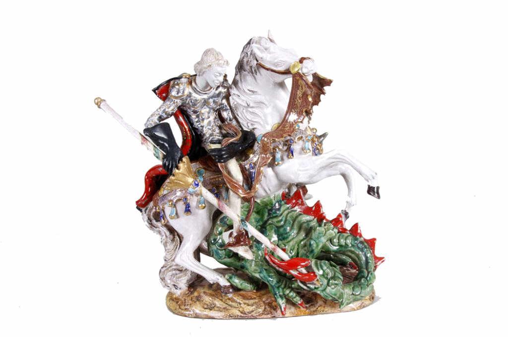 Porcelain Knight & Horse Fighting a Dragon Signed on base Mariohit, Italy. In overall good condition