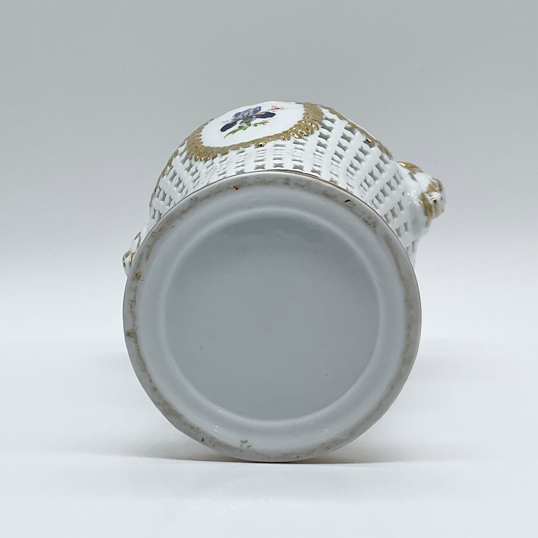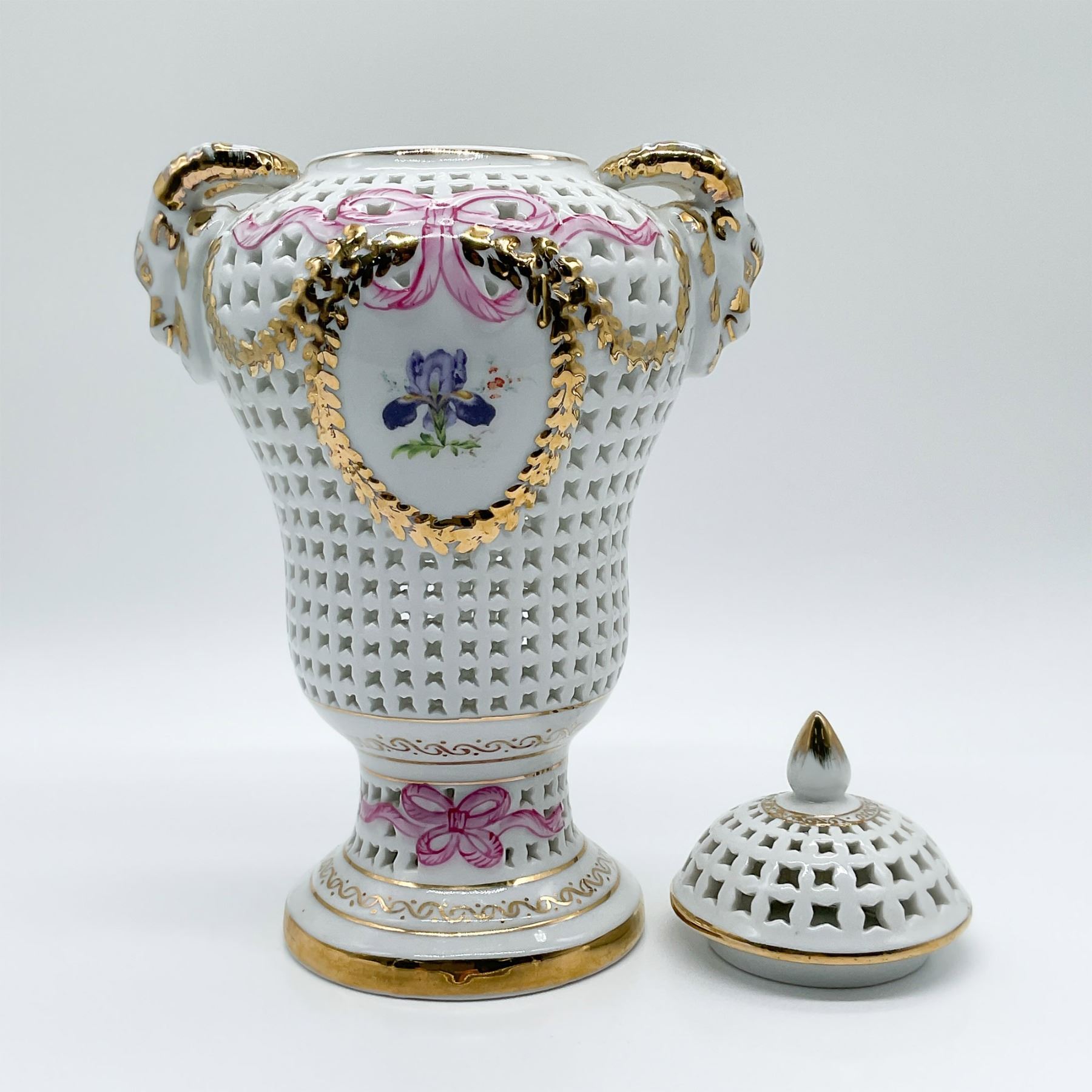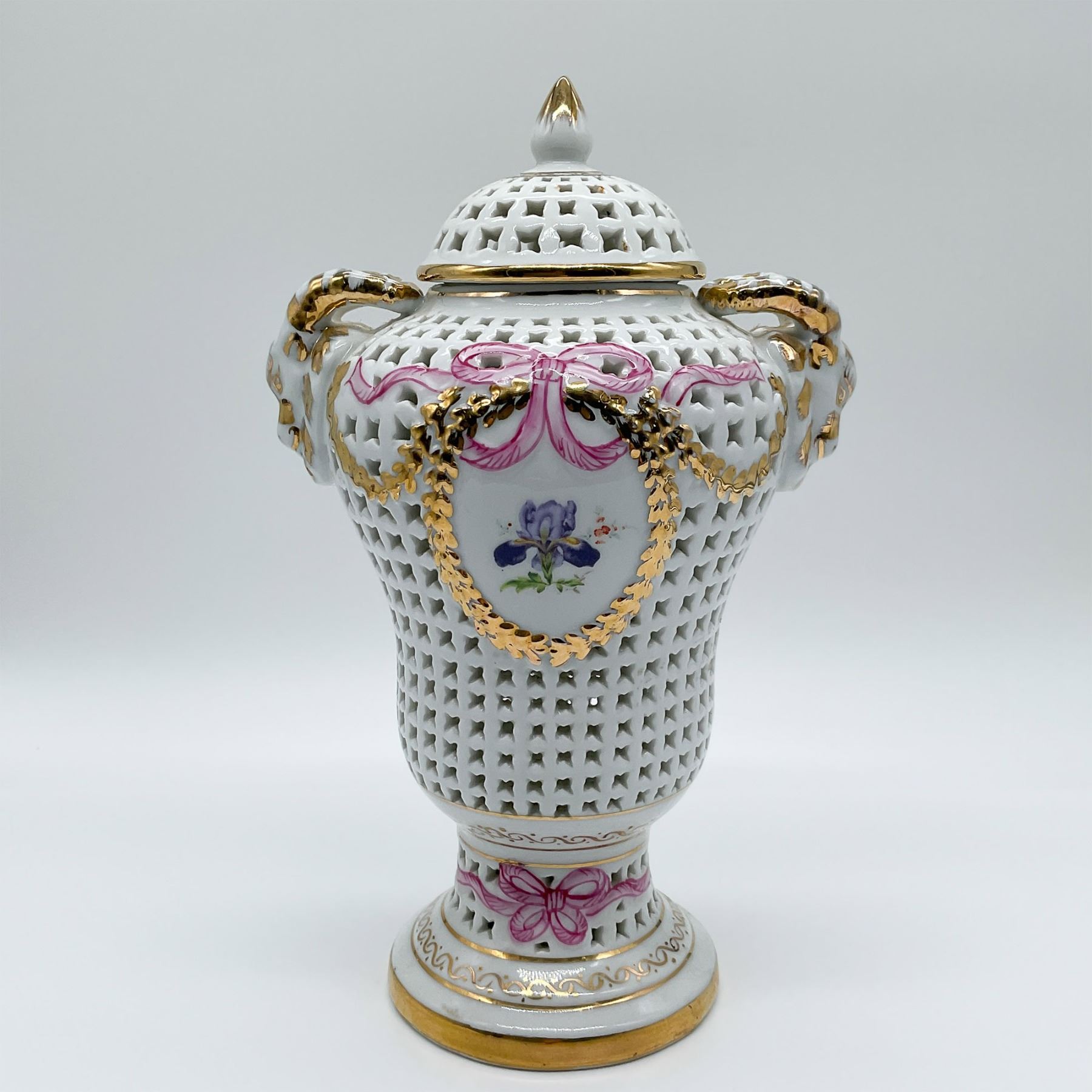 Porcelain lidded urn with a pierced design featuring small decorative holes. Handpainted with floral motifs, pink ribbon swags, and gilded laurel garlands. The lid includes a pierced dome and gold-accented finial.