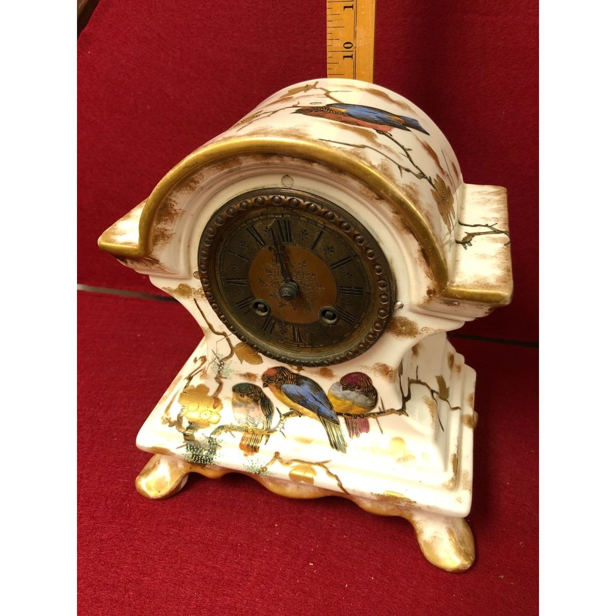 Porcelain mantal clock w/birds, very unusual clock, has cracks in case. Was in running condition at the estate