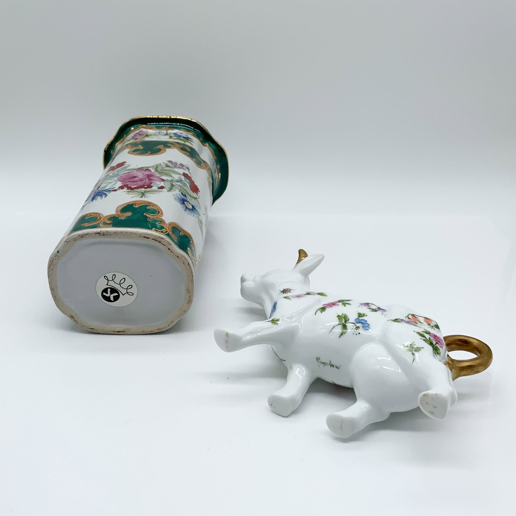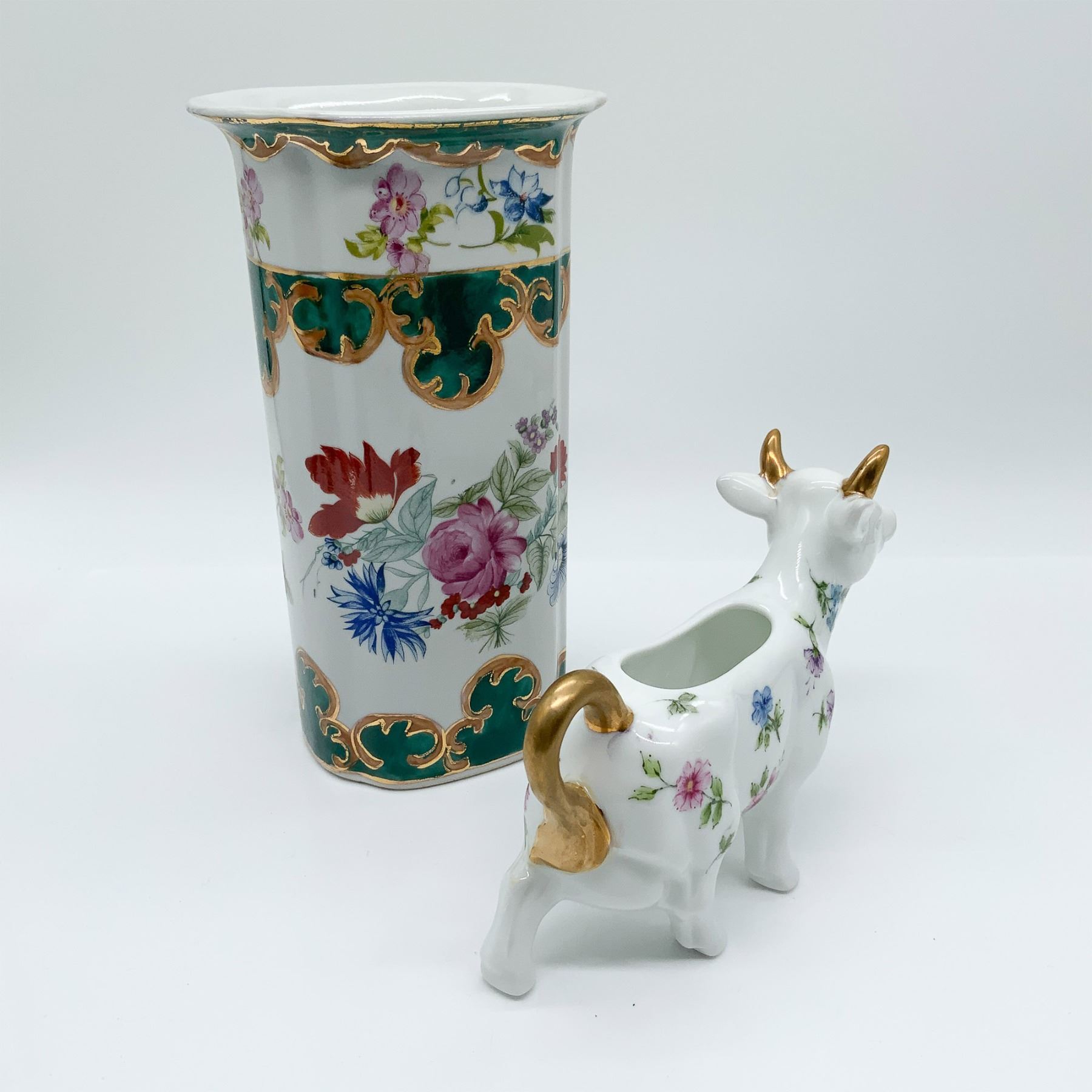 A charming pair of porcelain decorative items featuring a milk cow creamer and a tall vase. The milk cow creamer is adorned with delicate floral patterns and gold accents, with a backstamp reading "Renshaw." The tall vase is decorated with vibrant floral motifs and intricate gold detailing on a green band. The tallest item in the lot is 8 inches in height, making this a delightful addition to any collection or home décor.